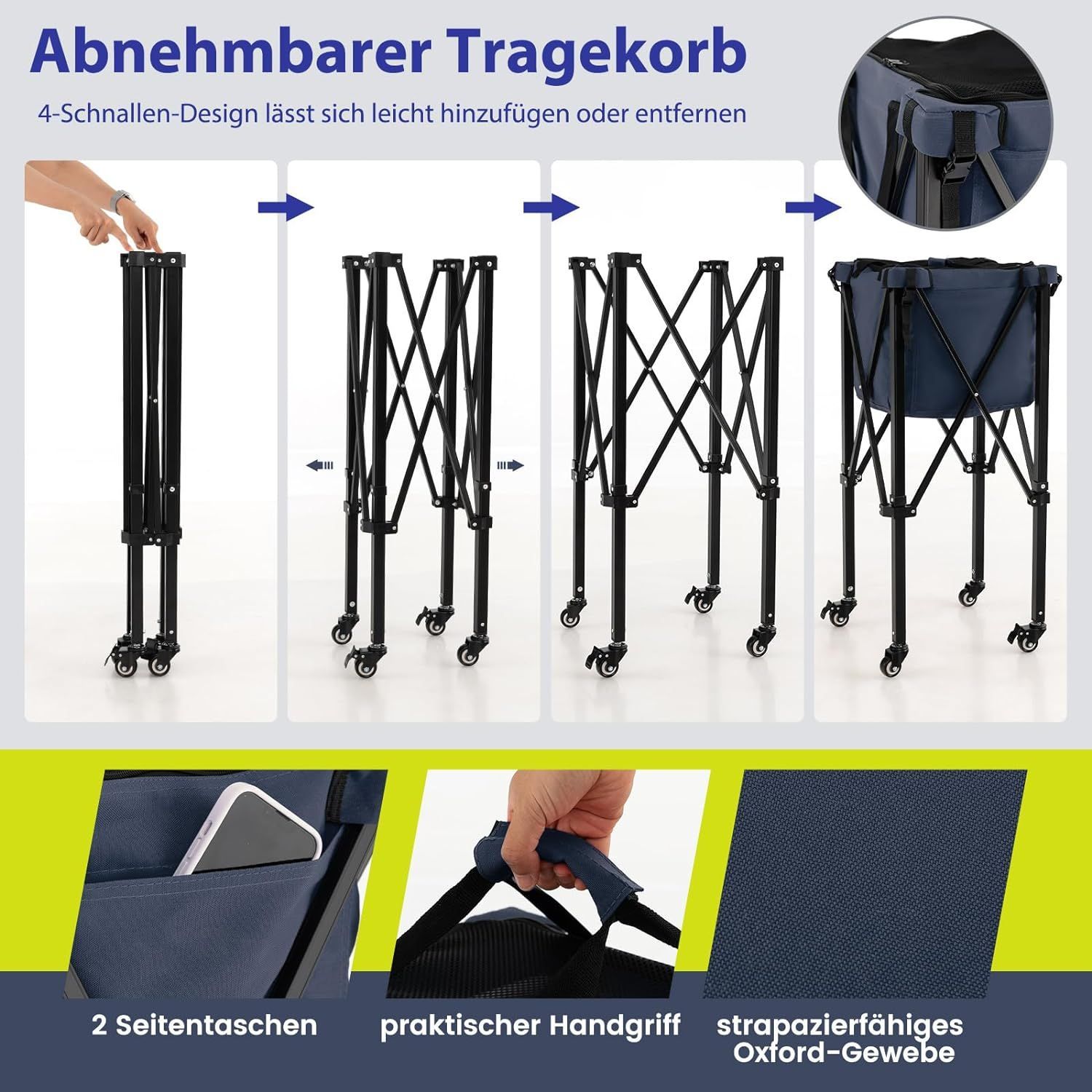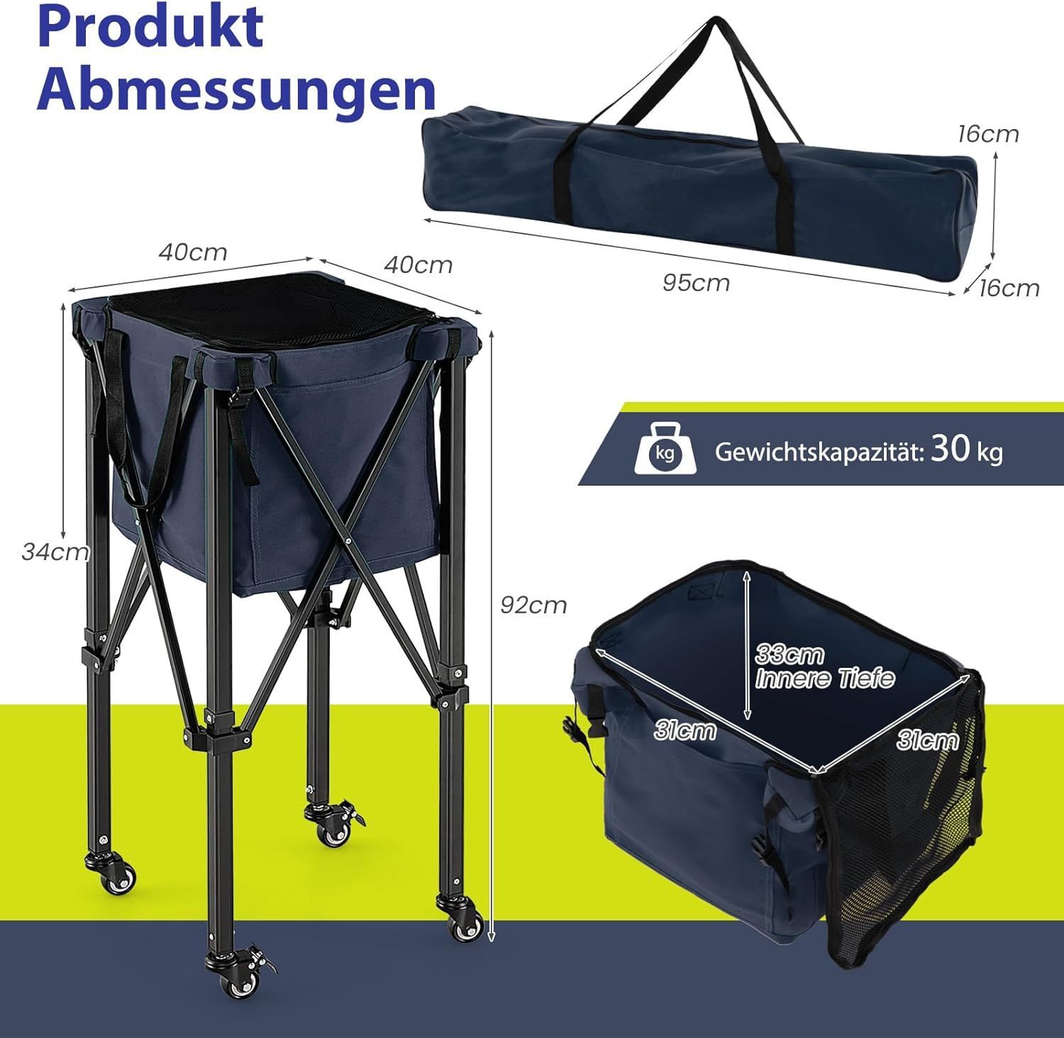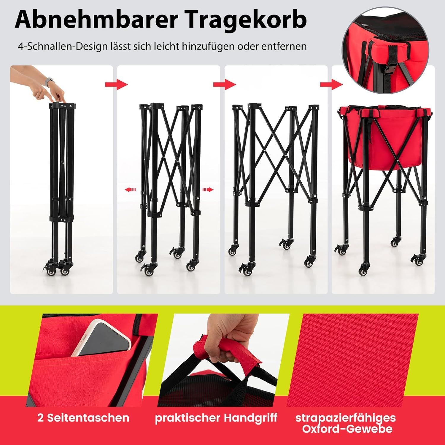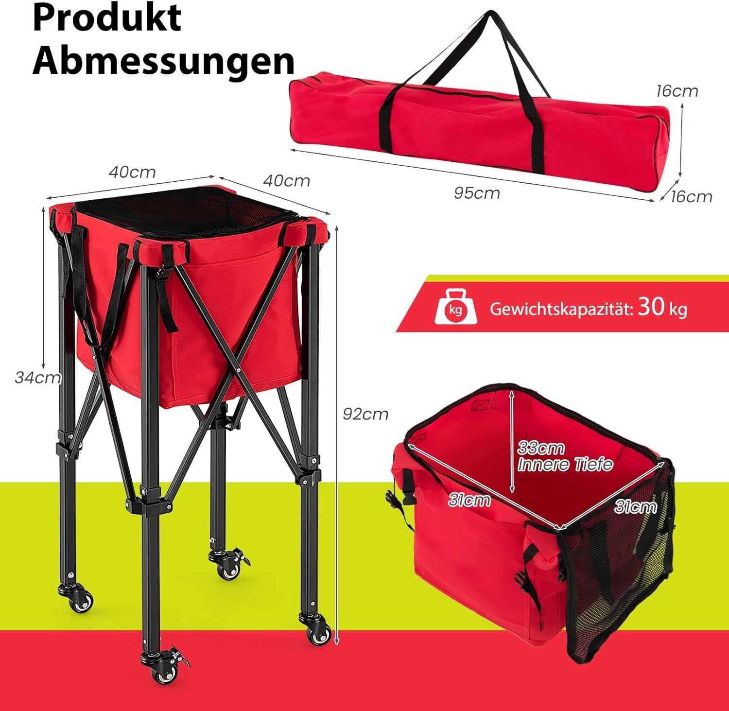 Tennisballwagen klappbar, Leichter Tennisballkorb mit Rädern, Seitentasche, bis 30 kg