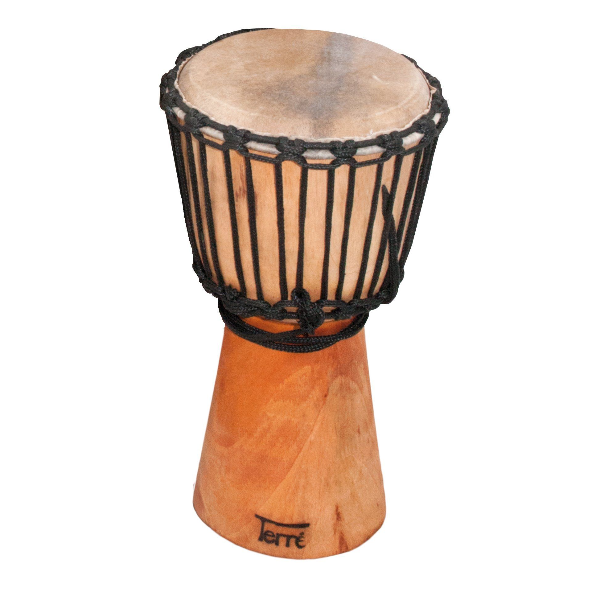 Terré Djembé Oil-finish 40cm Der Korpus dieser Djembé ist aus Mahagoniholz handgedrechselt und mit Ziegenhaut mittels einer mehrschichtigen Alpin Nylon-Polyesterschnur bespannt. Am Bauch der Trommel befindet sich ein geflochtener Tragegriff und eine Spannschnurreserve. Das Holz wird mit Leinöl behan
