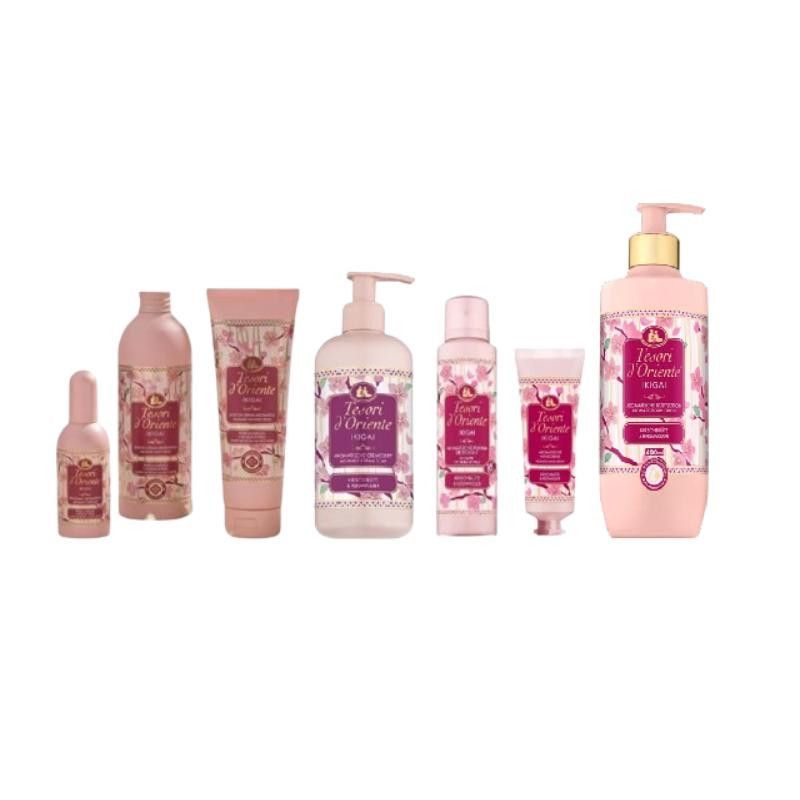 Tesori d’Oriente Ikigai PFLEGESET 7-TEILIG Duschgel, Badeschaum, Edt, Deo, Flüssighandseife, Handcreme, Bodylotion Tesori d’Oriente Ikigai Blumig-fruchtig mit süßer Vanillebasis. Eröffnet mit Kirschblüte, Pfirsich und Bergamotte, gefolgt von floralen Herznoten (Jasmin, Maiglöckchen, Rose) und einer