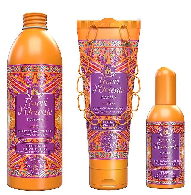 TESORI D´ORIENTE KARMA mit Nashi Blume und Zedernholz Geschenkset 3-Teillig 250ml Duschgel, 500ml Badeschaum & 100ml EdT Kopfnote: Bergamotte, Zitrone Herznote: Blumennoten Basisnote: Zeder