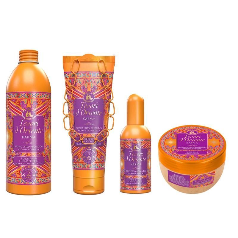 TESORI D´ORIENTE KARMA mit Nashi Blume und Zedernholz Geschenkset 4-Teillig 250ml Duschgel, 500ml Badeschaum, 100ml EdT & 300ml Körperpeeling Kopfnote: Bergamotte, Zitrone Herznote: Blumennoten Basisnote: Zeder