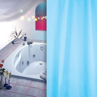 Duschvorhang in der Farbe hellblau Inkl. 12 weiße Ringe 180 cm breit 230 cm hoch Merkmale waschbar bis 40 Bügelbar 100% Polyester Beschwerungsband am unterem Saum eingearbeitet inkl. 12 weiße Ringe eingearbeitete Kunststoffösen