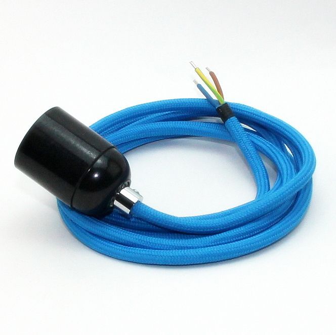 Textilkabel Lampenpendel blau mit E27 Bakelit Fassung schwarz Zugentlaster Metall