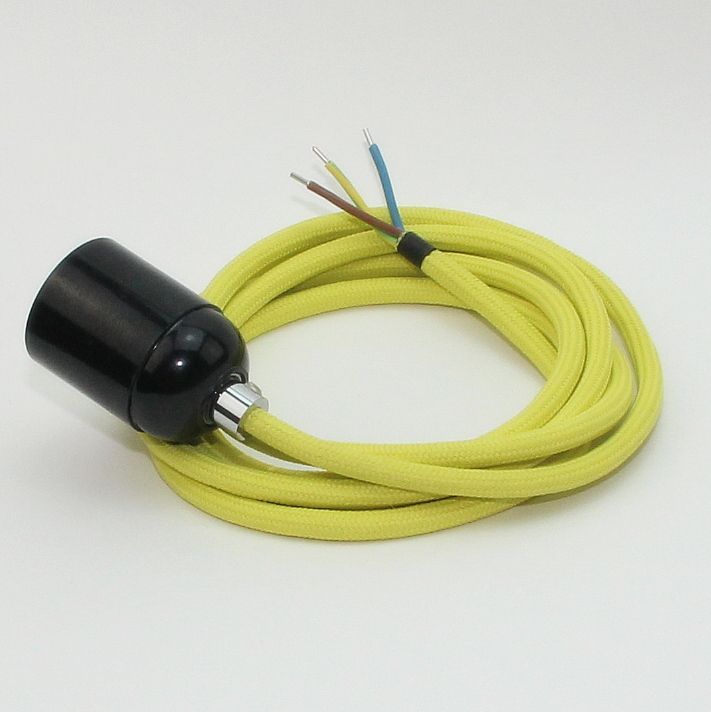 Textilkabel Lampenpendel gelb mit E27 Bakelit Fassung schwarz Zugentlaster Metall