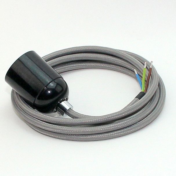Textilkabel Lampenpendel grau mit E27 Bakelit Fassung schwarz Zugentlaster Metall