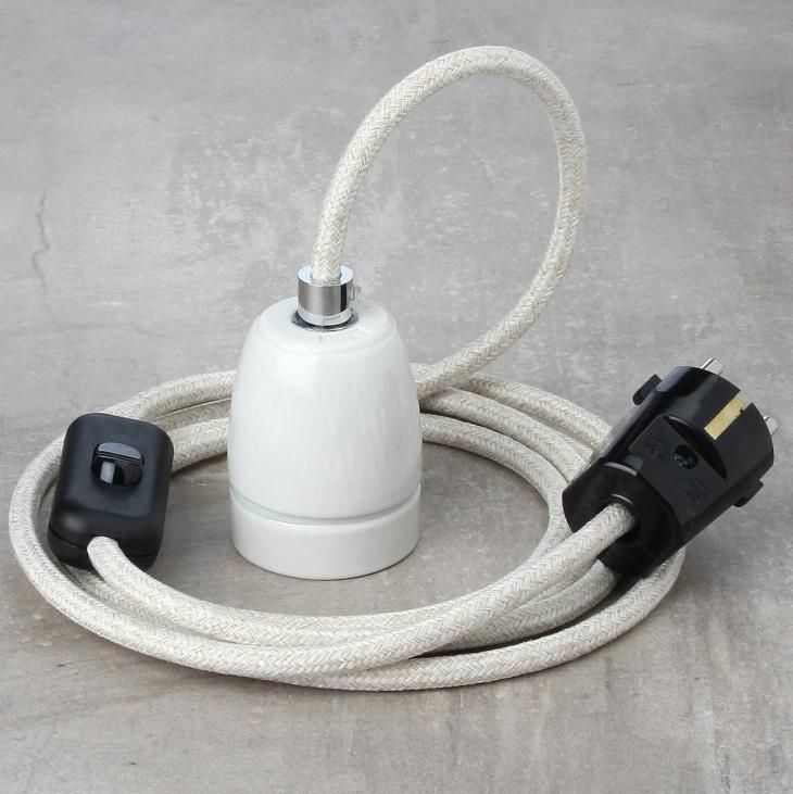 Textilkabel Lampenpendel kiesel mit E27 Porzellanfassung Schnurschalter und Schutz