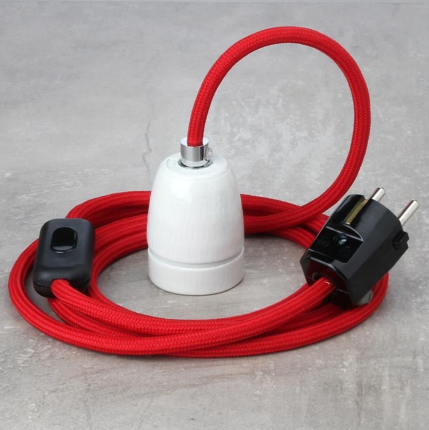 Textilkabel Lampenpendel rot mit E27 Porzellanfassung Schnurschalter und Schutzkon
