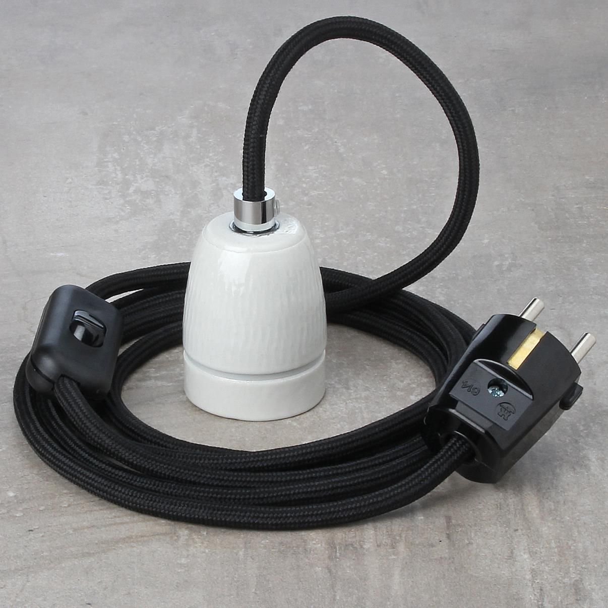 Textilkabel Lampenpendel schwarz mit E27 Porzellanfassung Schnurschalter und Schut