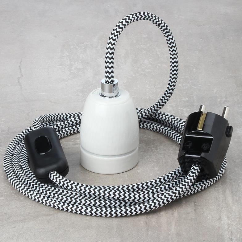Textilkabel Lampenpendel schwarz-weiß Zick-Zack Muster mit E27 Porzellanfassung
