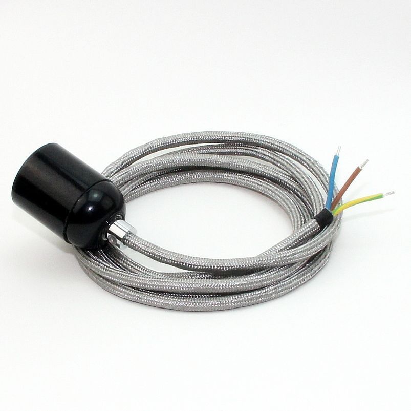 Textilkabel Lampenpendel silber mit E27 Bakelit Fassung schwarz Zugentlaster Metal