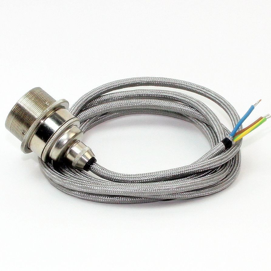 Lampenpendel mit silbernem Textilkabel (3x0,75 mm², flexibel), Länge 1–5 m. E27 Metall Vintage-Fassung Nickel matt, inkl. Schraubring, Made in Germany.