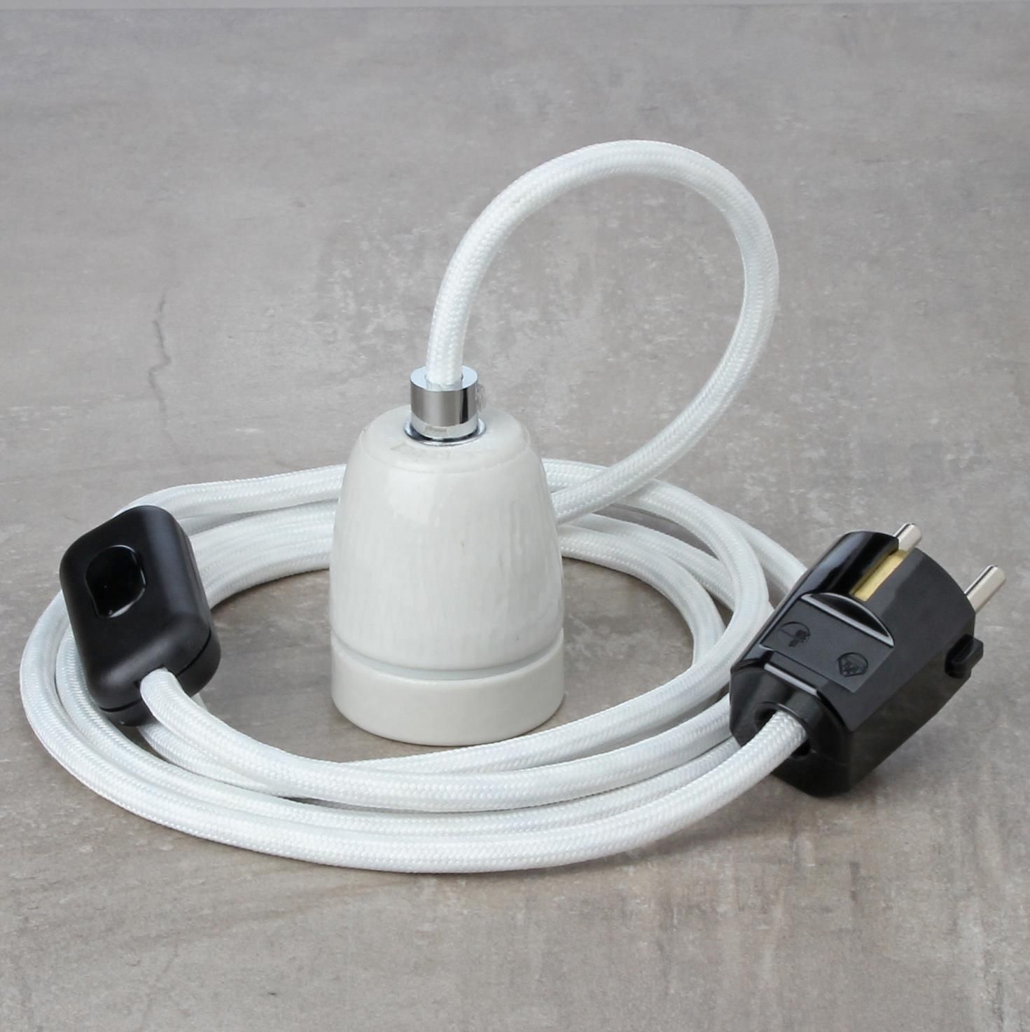 Textilkabel Lampenpendel weiß mit E27 Porzellanfassung Schnurschalter und Schutzko