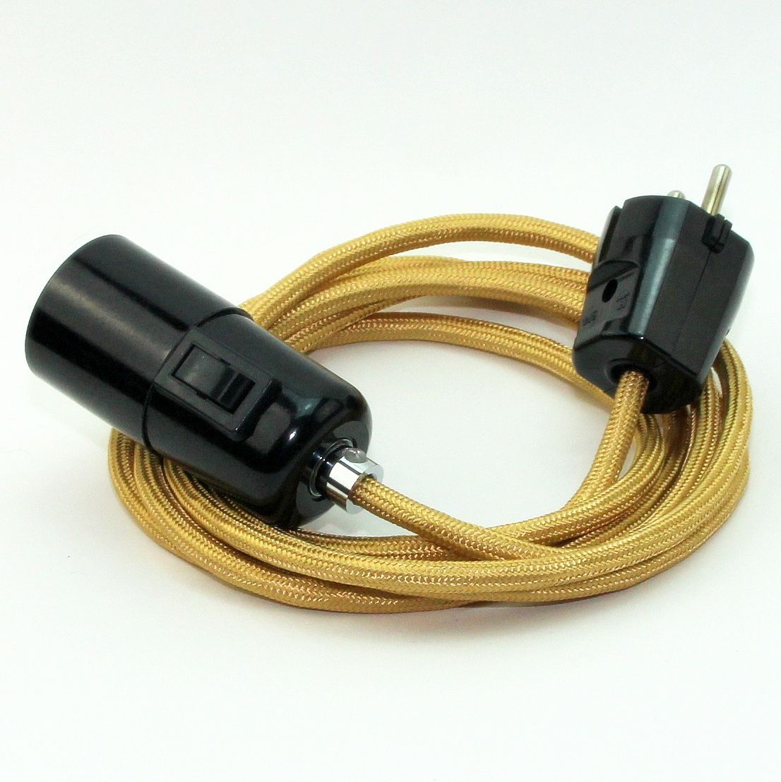 Textilkabel Pendel gold E27 Bakelit Vintage Fassung mit Schalter schwarz und Schut