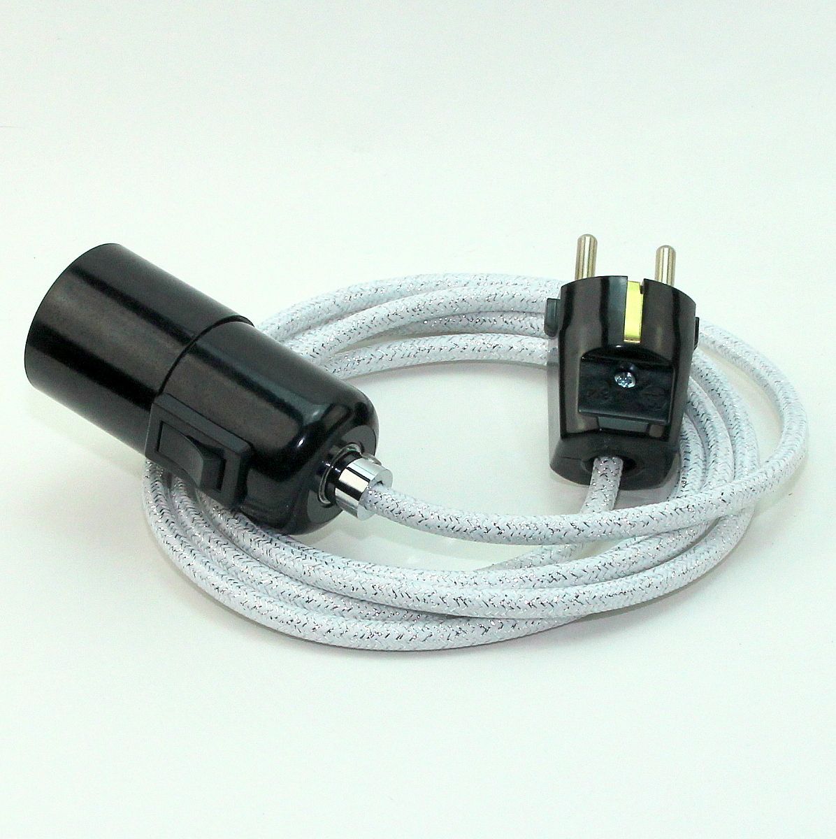 Textilkabel Pendel weiß metallic E27 Bakelit Vintage Fassung mit Schalter schwarz