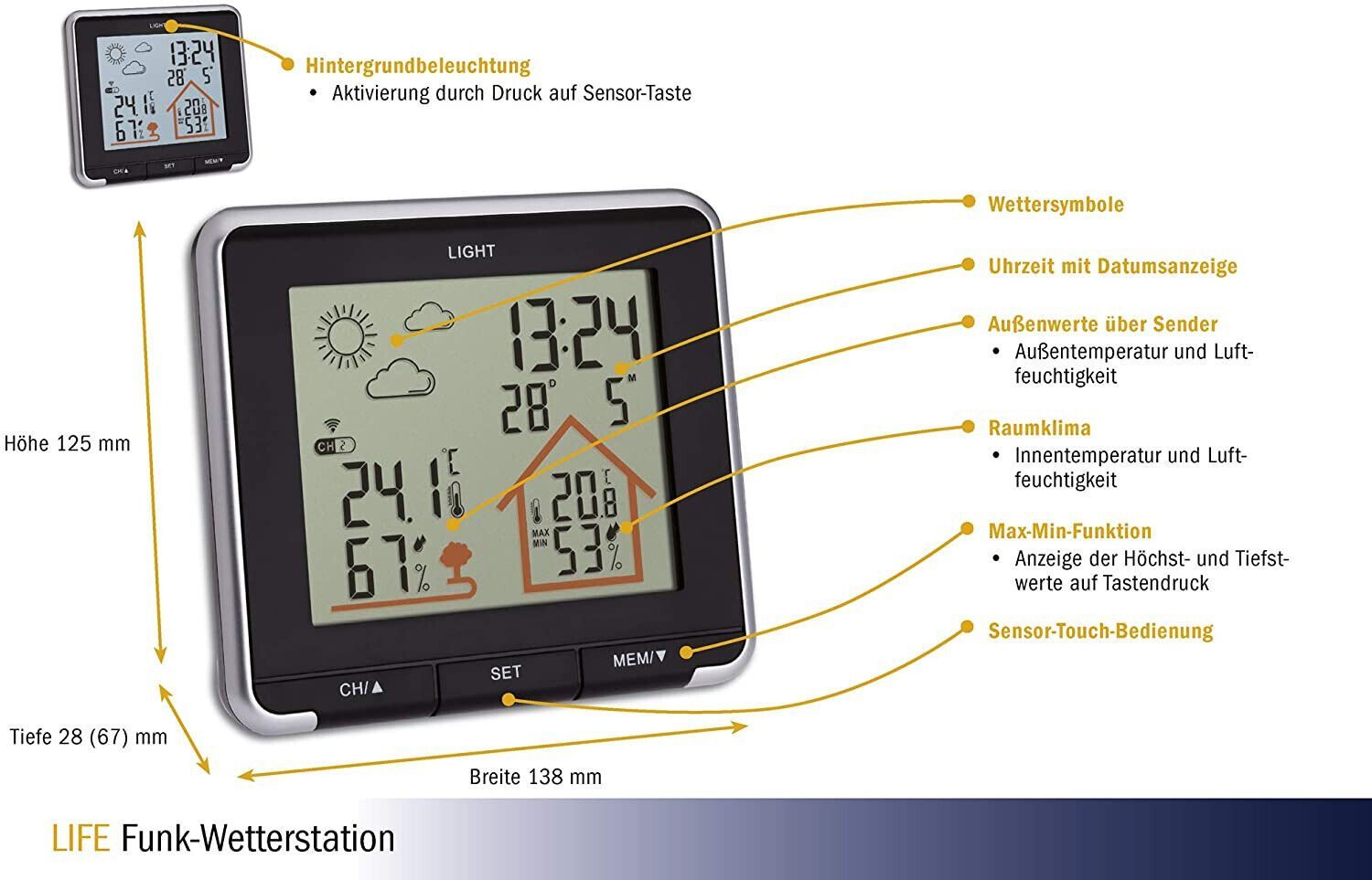 TFA Dostmann Life Digitale Funk Wetterstation Aussensensor Wettersymbole schwarz
