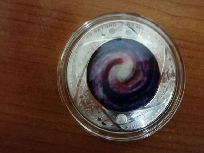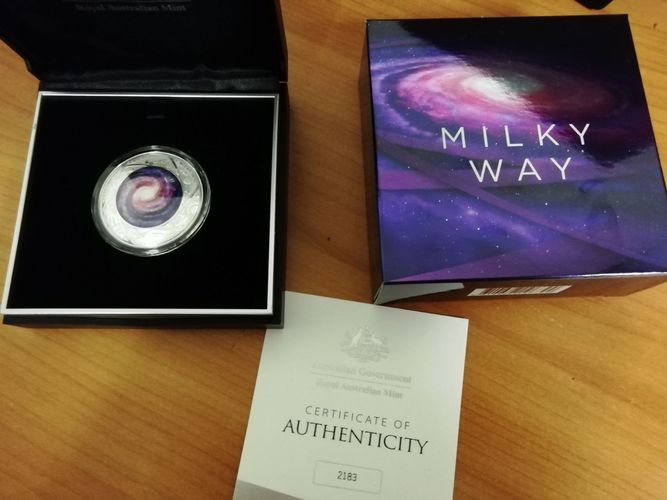 the earth & beyond - milky way 1 Oz silver proof coloured doomed coin vollständig wie von der Prägestatte herausgegeben mit Etui, CoA und Umverpackung Sondermünze der RAM $ 5 1 Oz SILBER 99,9% Silbergehalt 4. Münze der earth & beyond Serie Jahr 2021 mintage 2183 von 6000 39,62 mm