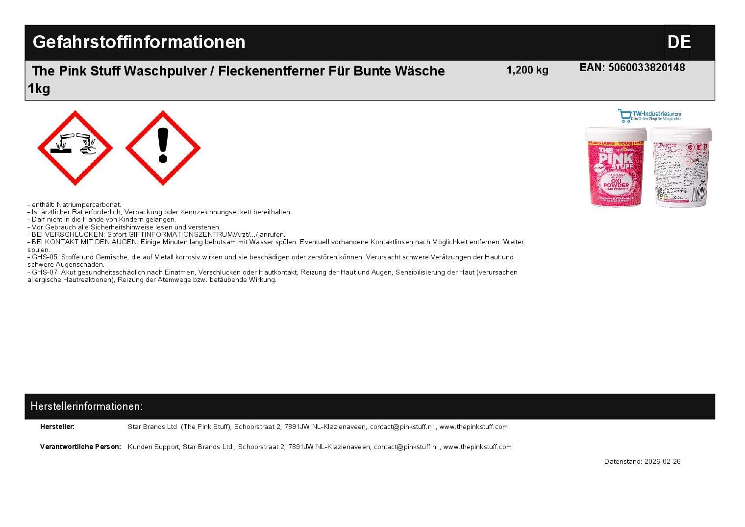 The Pink Stuff Waschpulver / Fleckenentferner Für Bunte Wäsche 1kg
