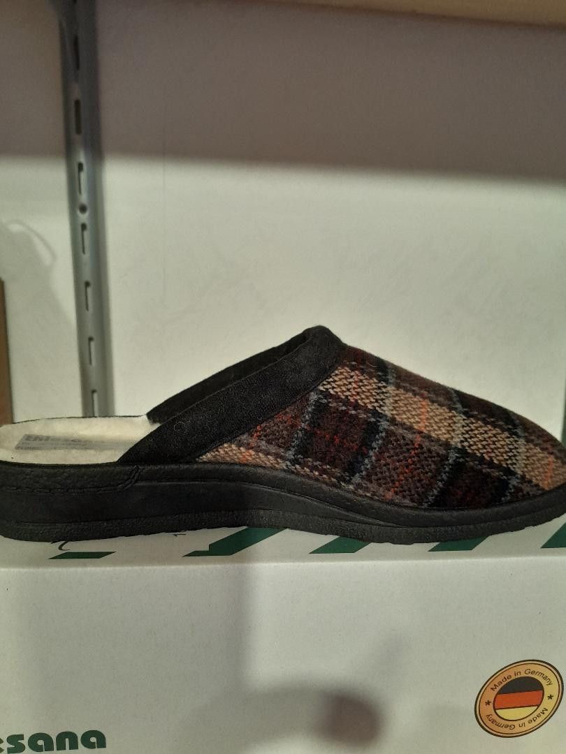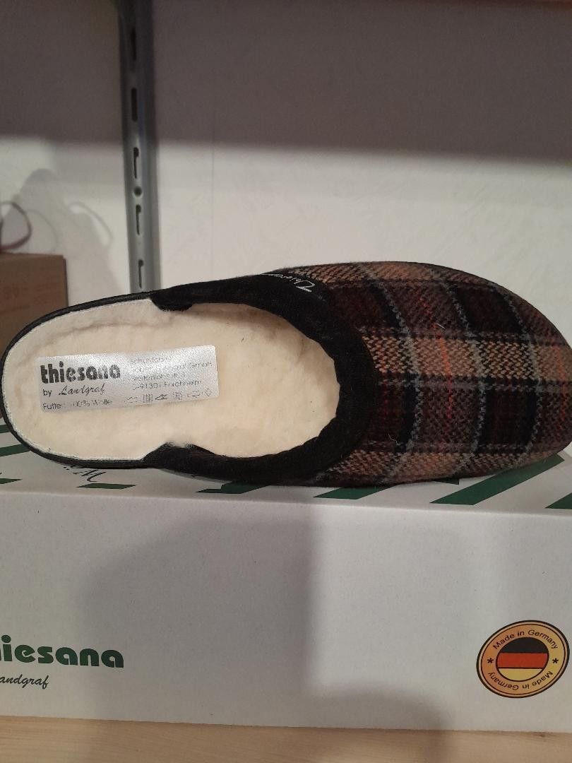 Hausschuhe thiesana by Landgraf Deutsches Markenfabrikat Modell: Andy mit Schurwolle Farbe: Braun Karo - Art. Nr. 35560018 Tun Sie Ihren Füßen etwas Gutes Details: Obermaterial: Textil Futter: Schurwolle, warm gefüttert Innensohle: Textil Laufsohle: Gummisohle, Synthetik, flexibel Fersendämpfung Pas