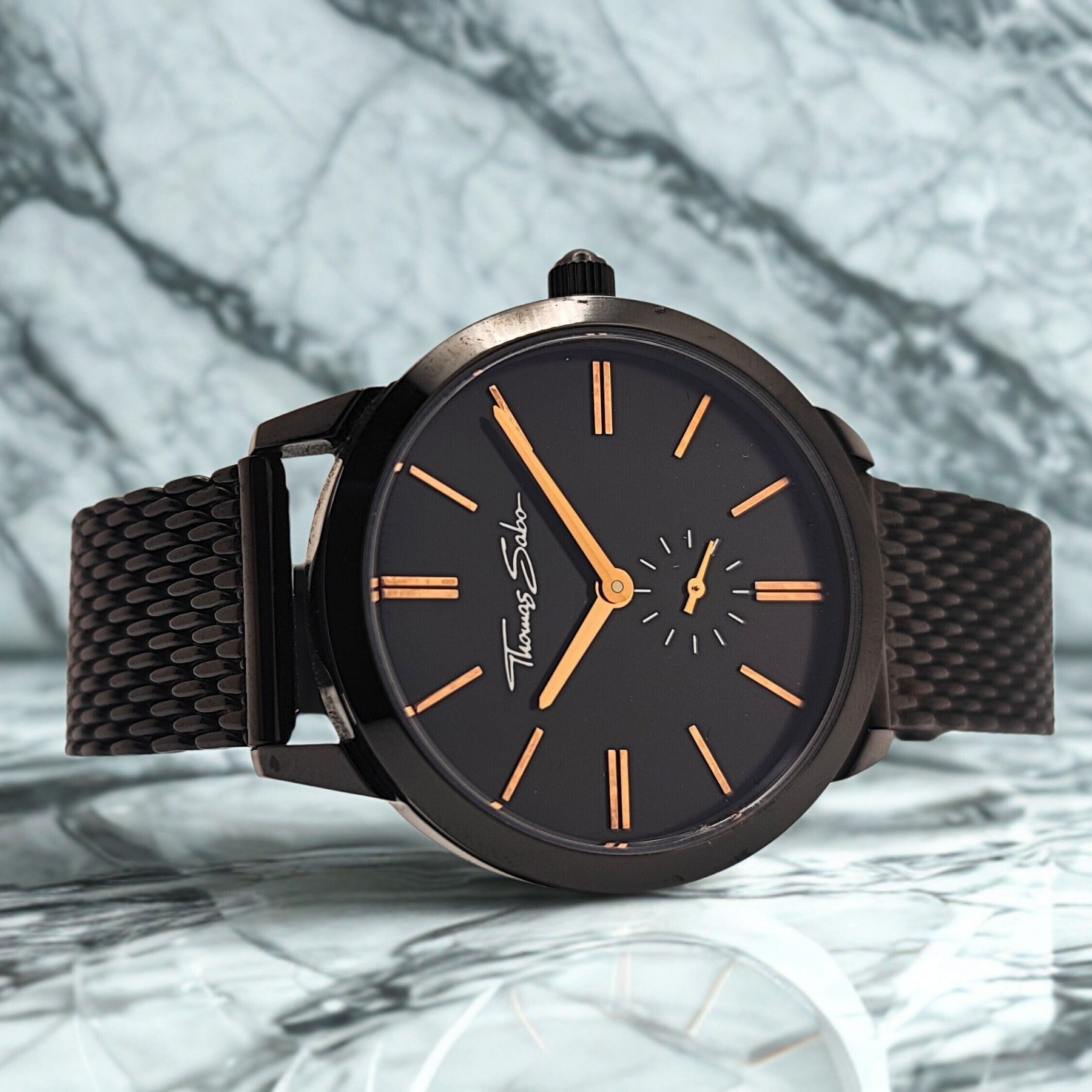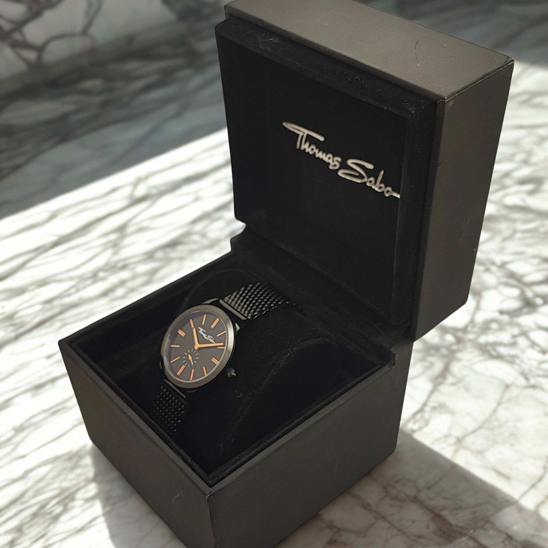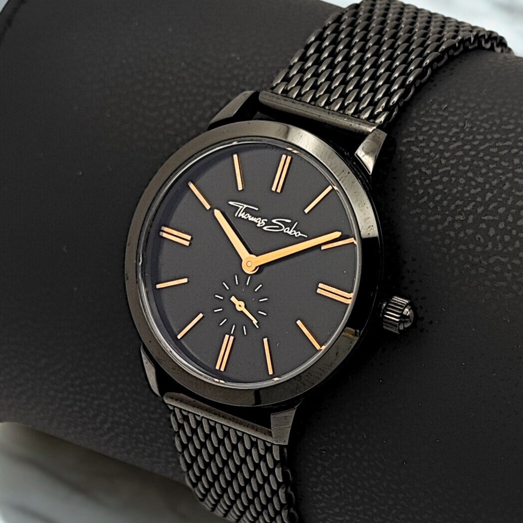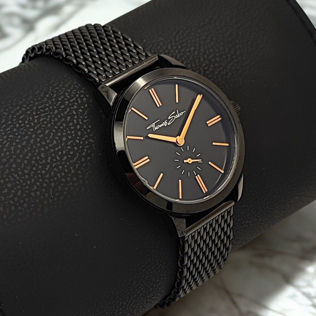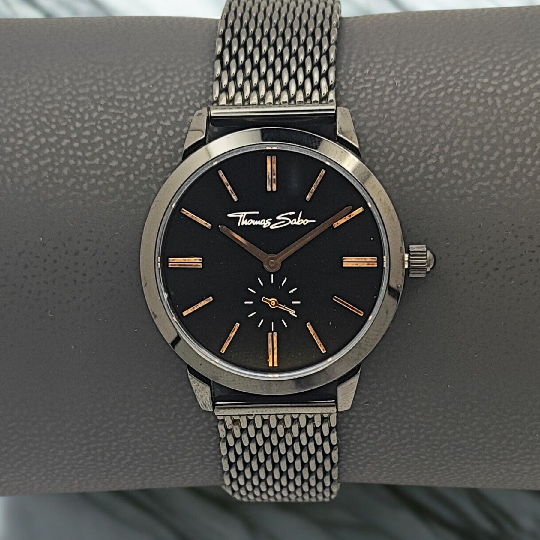Sonnenschliff - Milanaise Armband - Thomas Sabo Sterling Silver Damenarmbanduhr – Ref. WA0277-202-203-33 Die elegante Damenuhr aus der Thomas Sabo Sterling Silver Kollektion überzeugt mit stilvoller Zurückhaltung und edlen Akzenten. Das schwarze Zifferblatt mit feinem Sonnenschliff erzeugt faszinier... Mehr