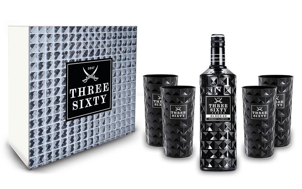 Three Sixty Three Sixty Geschenkset Three Sixty Black Vodka 0,7L 700ml (42% Vol) + 4 Gläser Black