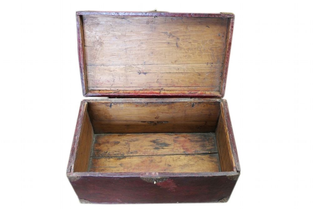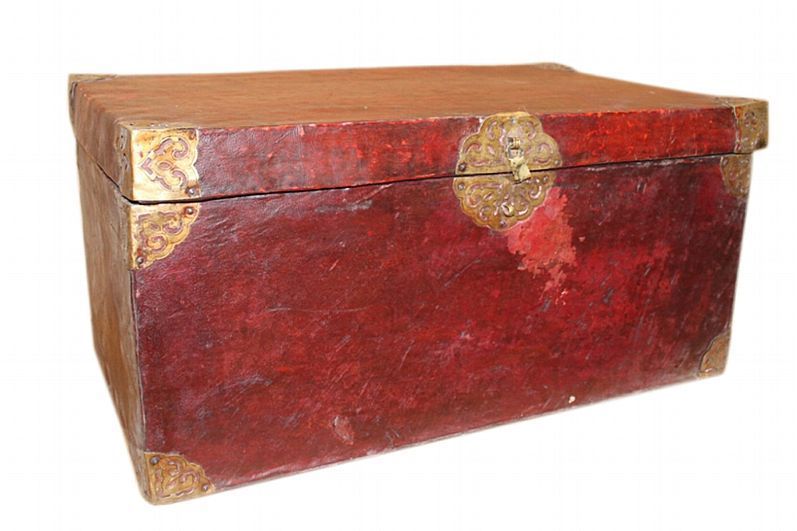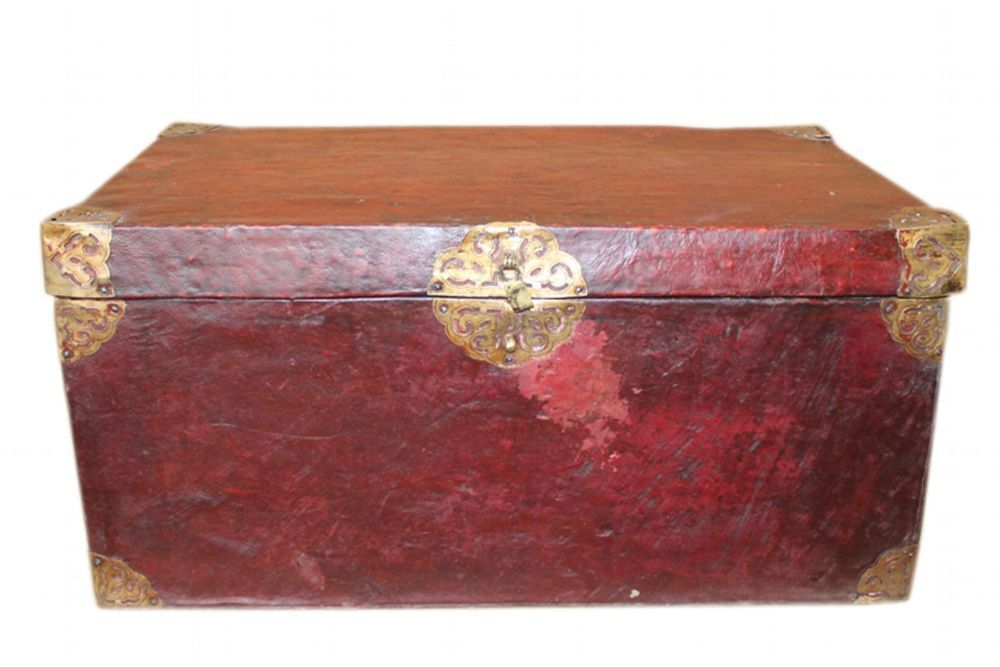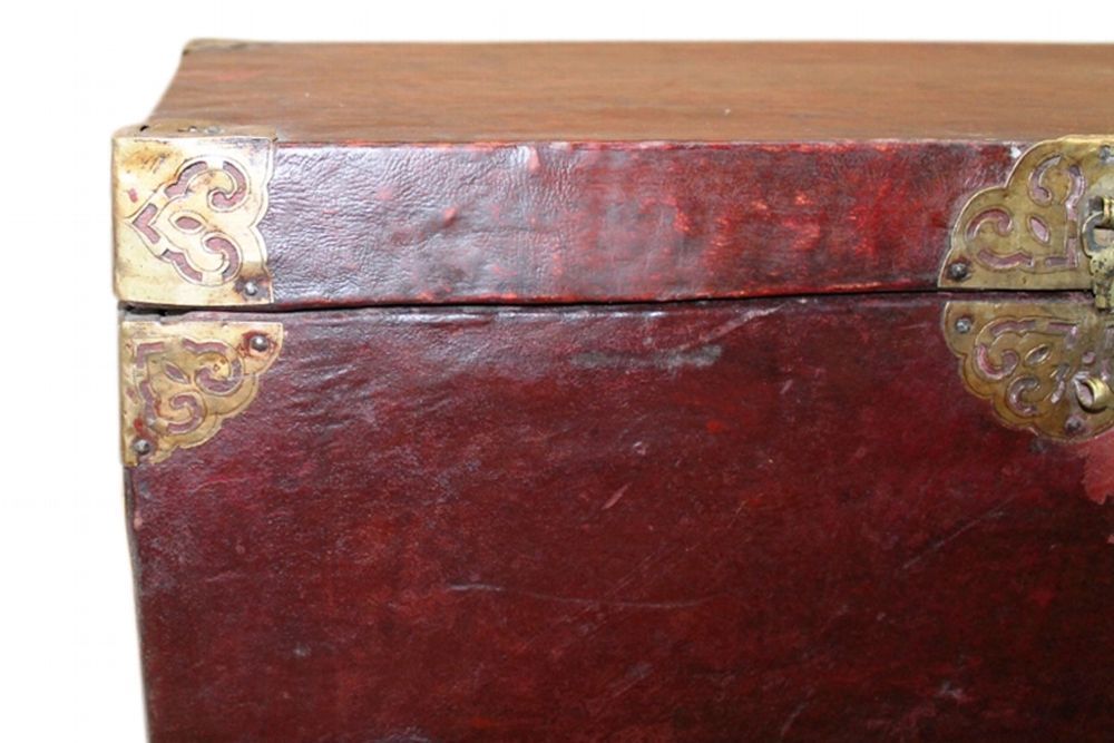 Tibet 1930 seltene Truhe Holz mit Bueffelleder bezogen Messingbeschlaege
