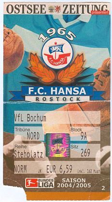benutztes (used) Fußball-Ticket (Eintrittskarte biglietto entrada kaartje bilet) zum Spiel der deutschen ( Deutschland GERMANY) Bundesliga FC Hansa Rostock vs VfL Bochum am 12. 3. 2005 (ca. 8 x 15 cm; Mittelknick kink in the middle ) * Versand nach Deutschland kostet für diese Eintrittskarte 1 Euro.