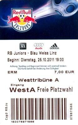 Benutztes Ticket Eintrittskarte (Westtribüne A) zum Spiel im ÖFB-Cup-Achtelfinale zwischen Red Bull Salzburg Juniors (RB) und FC Blau-Weiß Linz (SK VÖEST VOEST BW Stahl) am 25. 10. 2011 im Stadion Wals-Siezenheim (ca. 8,5 x 5,5 cm) Bei Ersteigerung mehrerer Artikel aus meinem Angebot gibt es natürli