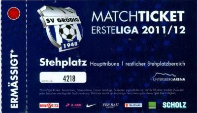 Benutztes Ticket Eintrittskarte (Stehplatz Haupttribüne ermäßigt) zu einem Spiel der Erste Liga (=zweite Liga Österreich) des SV Grödig (Salzburg) aus der Saison 2011 2012 (ca. 9 x 15,5 cm) Bei Ersteigerung mehrerer Artikel aus meinem Angebot gibt es natürlich Rabatt bei den Versandkosten, die sich