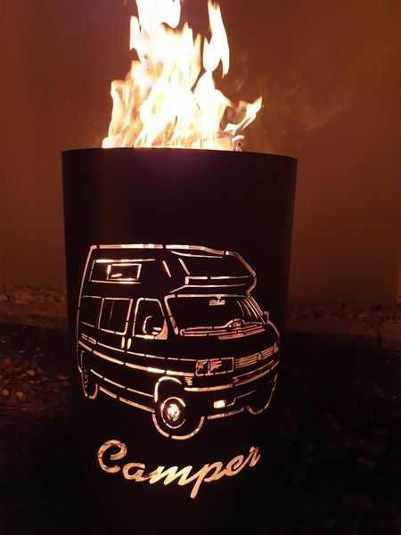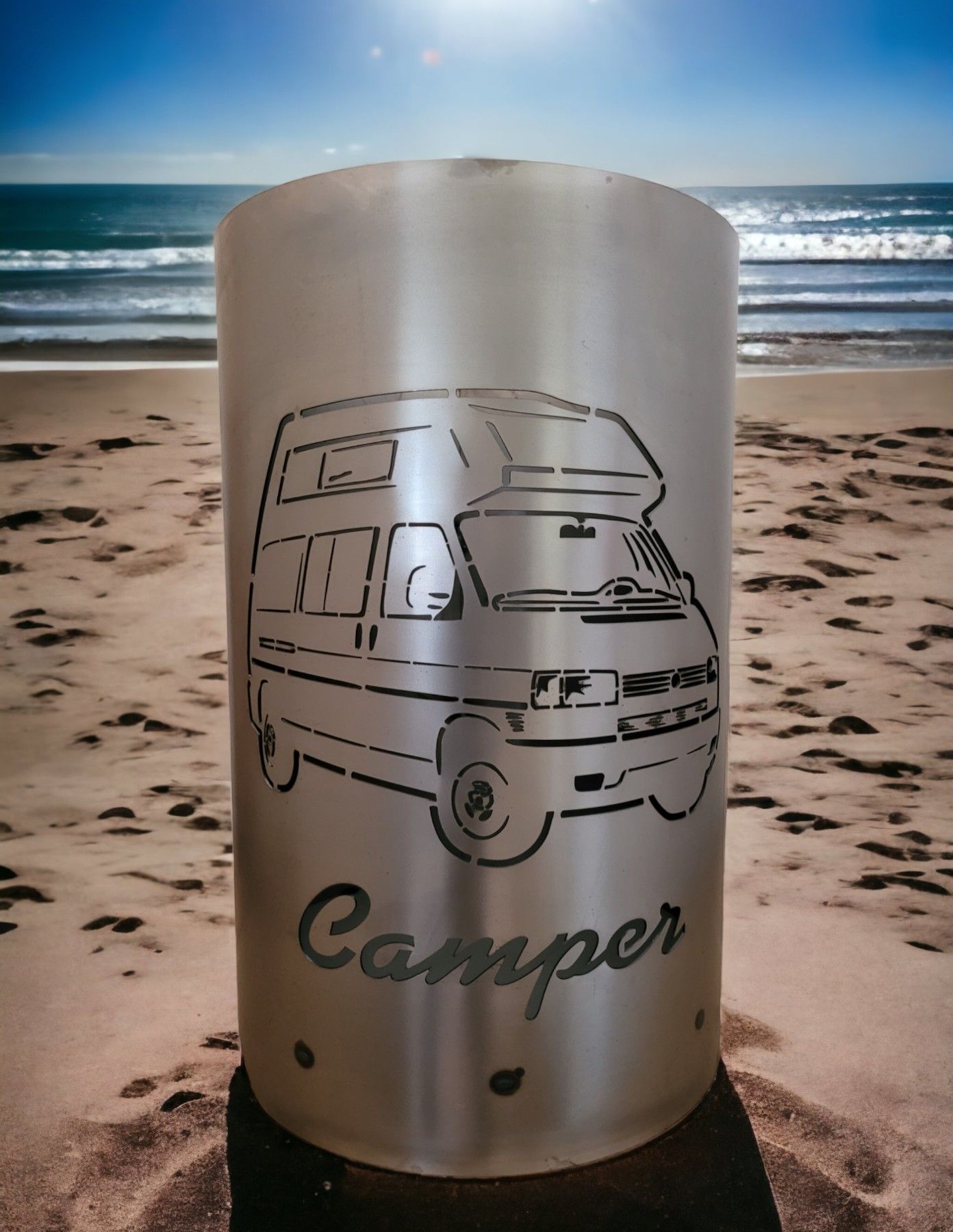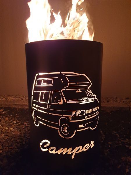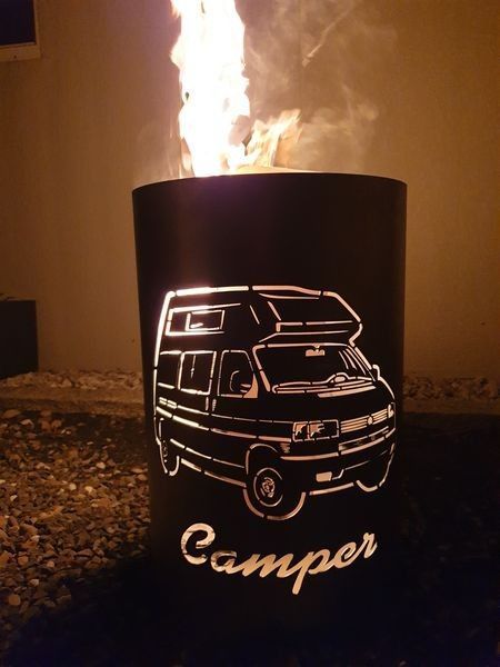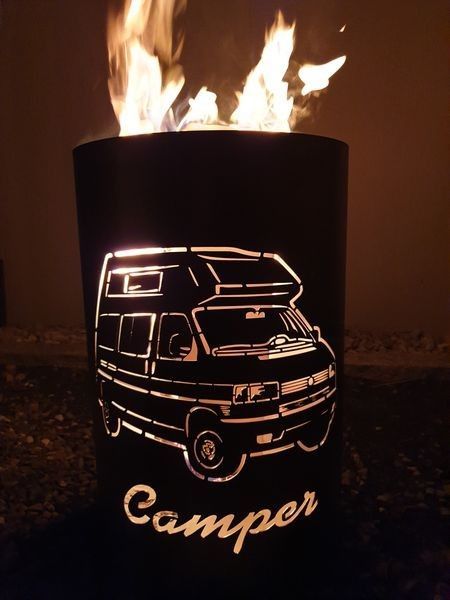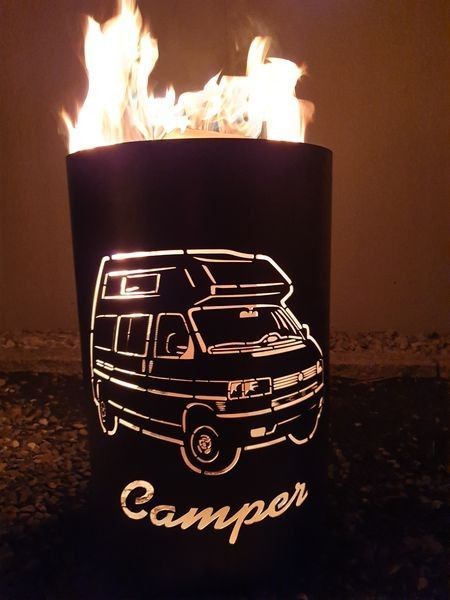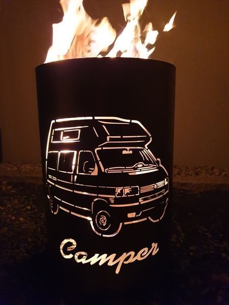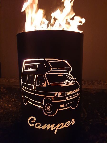 Tolle Feuertonne mit Motiv CAMPER Der Eycatcher auf jeder Garten Party und für jeden Camper ein Highlight im Garten. Sobald die Feuertonne in Betrieb genommen wird erscheint das Motiv in voller Schönheit und sorgt für gute Stimmung und staunende Gesichter. Nebenbei sorgt die Tonne auch für mollige W