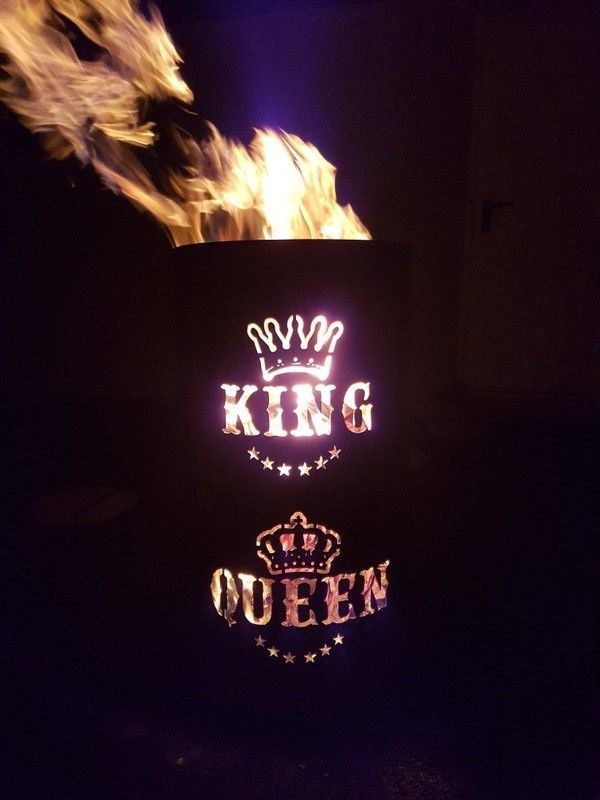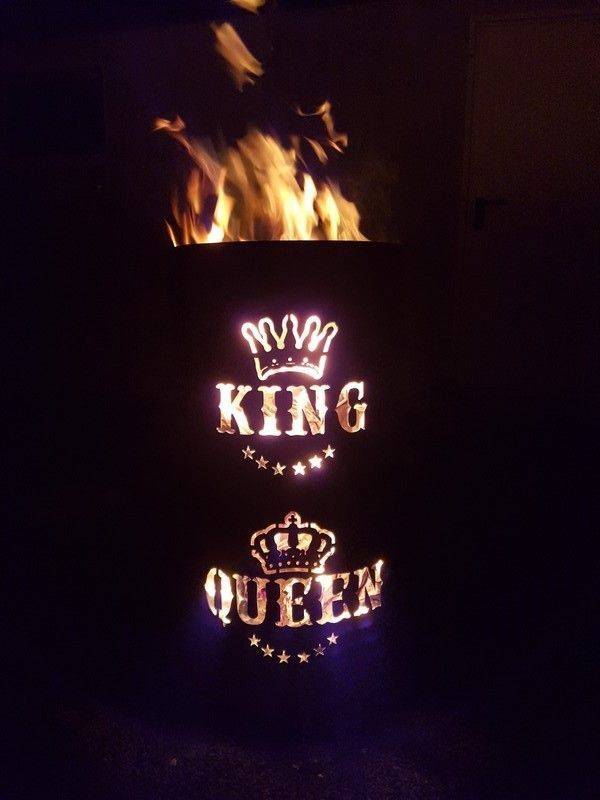 Feuertonne Feuerkorb mit Motiv King & Queen Der Eycatcher auf jeder Garten Party und ein Highlight bei ihrem nächsten Event. Sobald die Feuertonne in Betrieb genommen wird erscheint das Motiv in voller Schönheit und sorgt für gute Stimmung und staunende Gesichter. Nebenbei sorgt die Tonne auch f