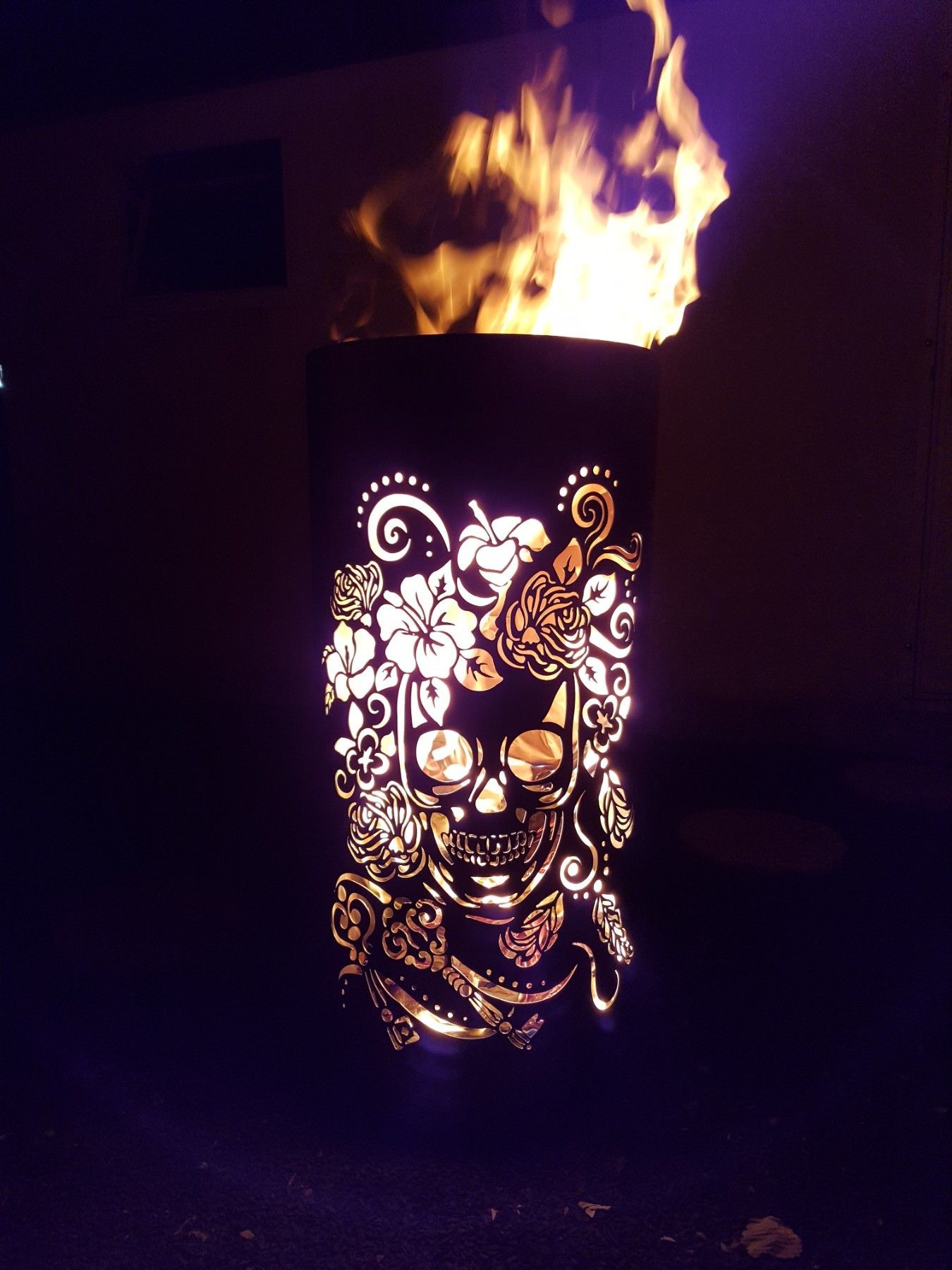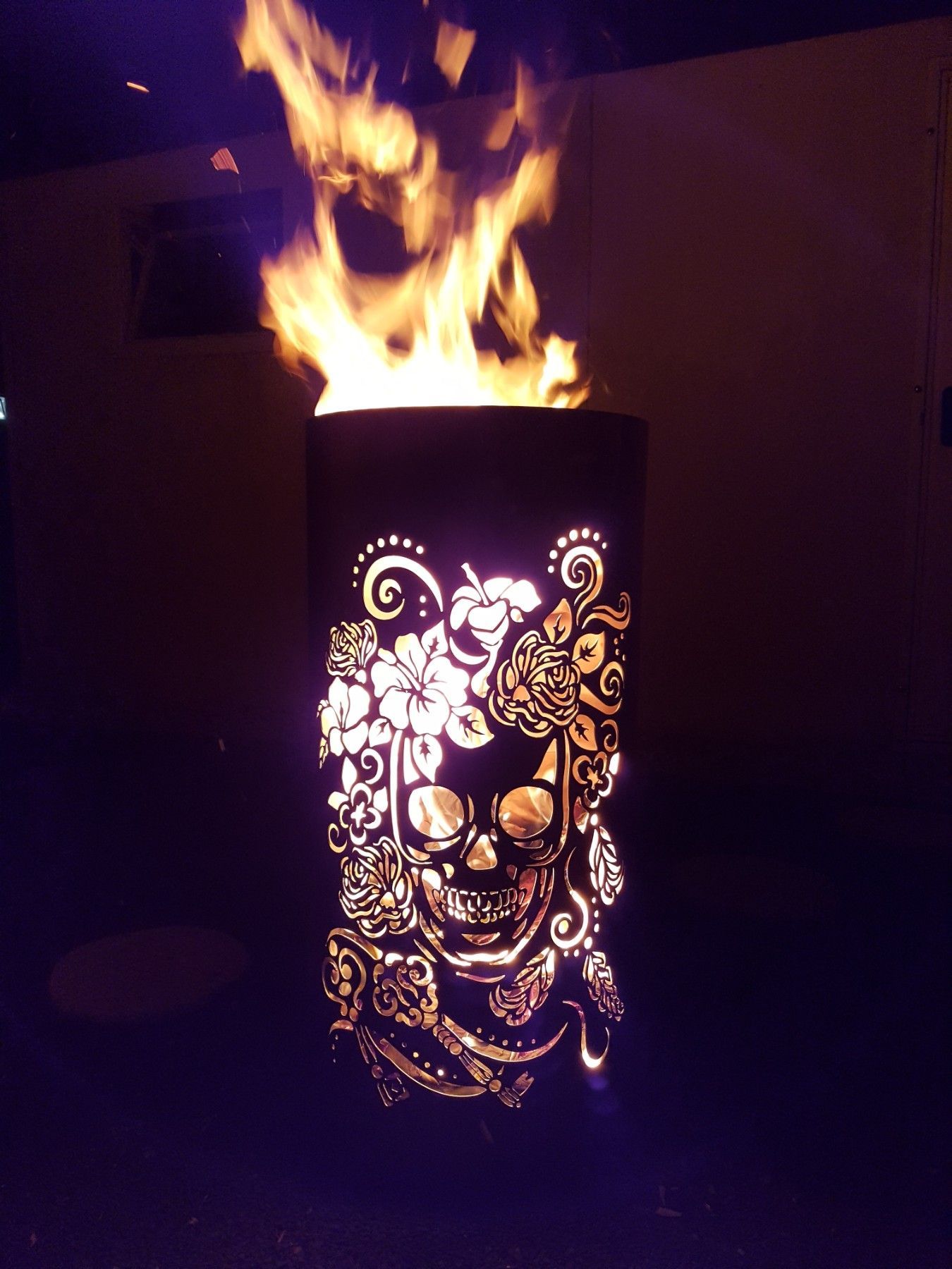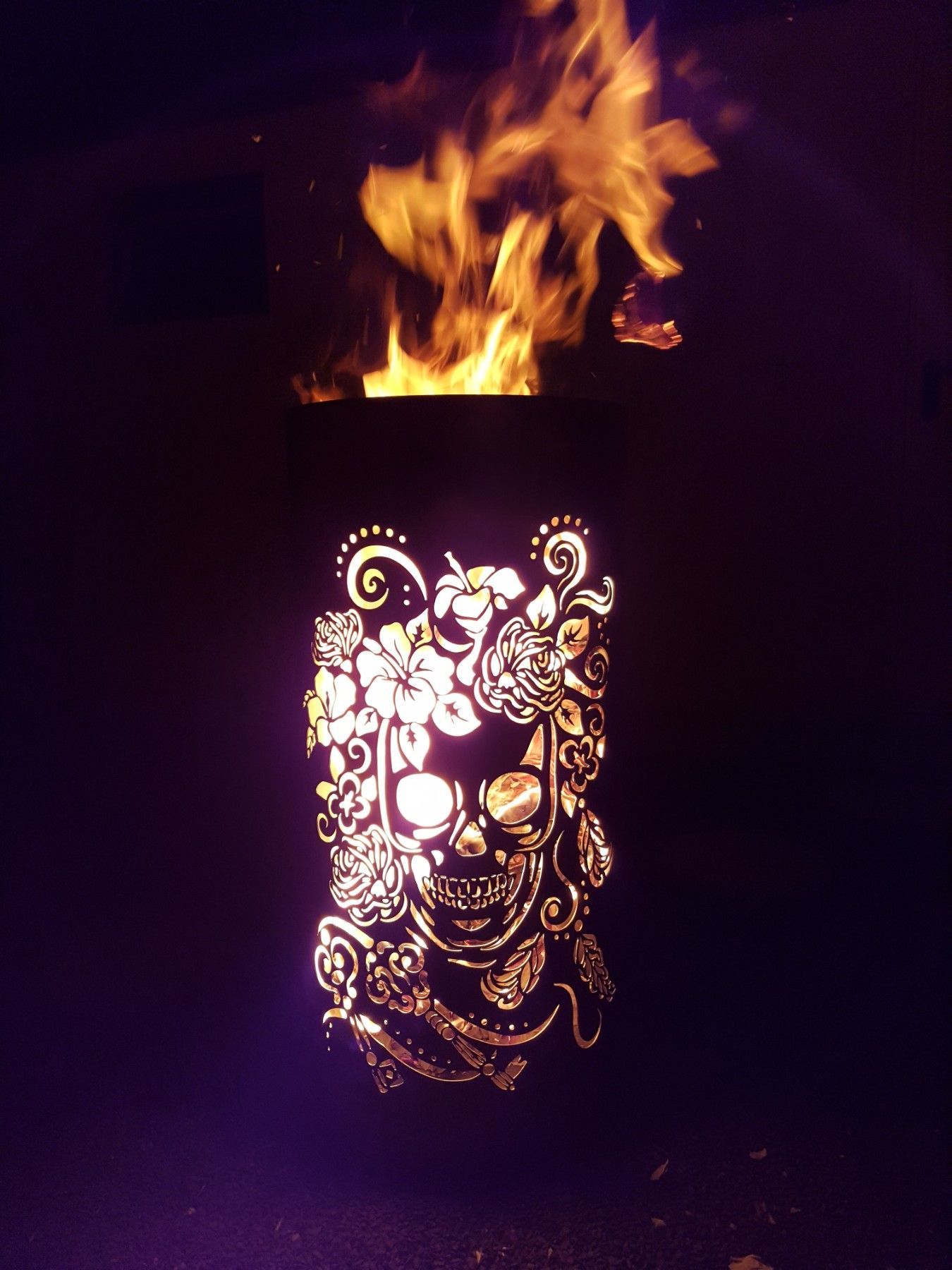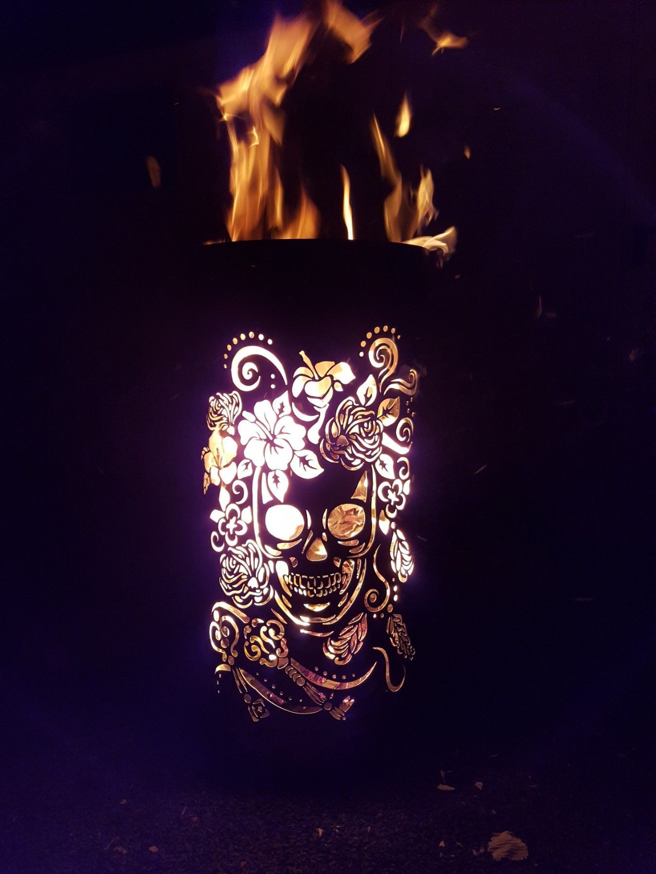 Coole Feuertonne Feuerkorb mit Motiv Skull and Flowers Der Eycatcher auf jeder Garten Party und ein Highlight bei ihrem nächsten Event. Sobald die Feuertonne in Betrieb genommen wird erscheint das Motiv in voller Schönheit und sorgt für gute Stimmung und staunende Gesichter. Nebenbei sorgt die Tonne
