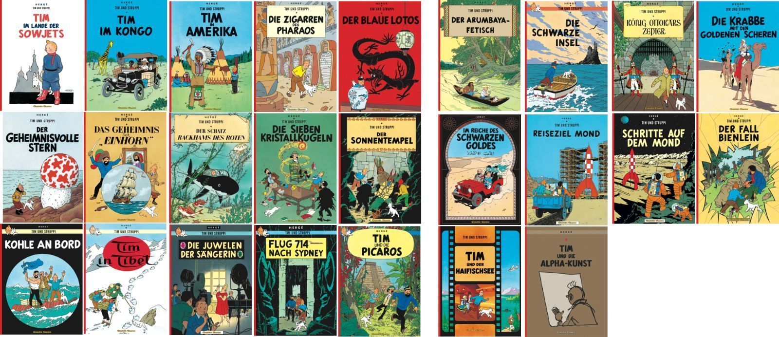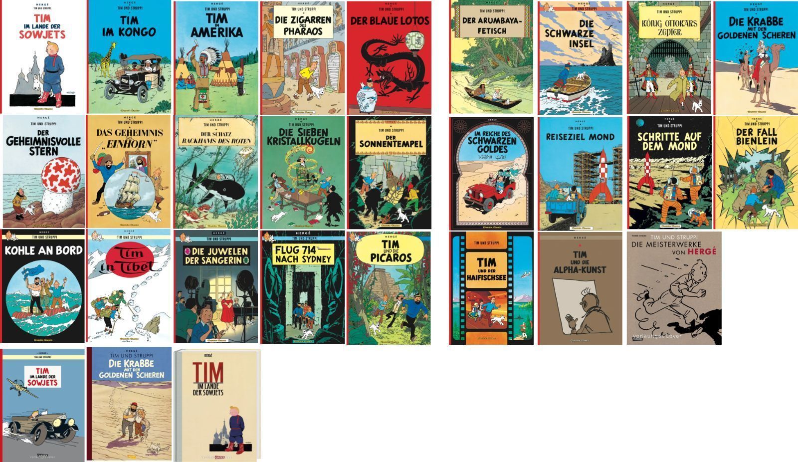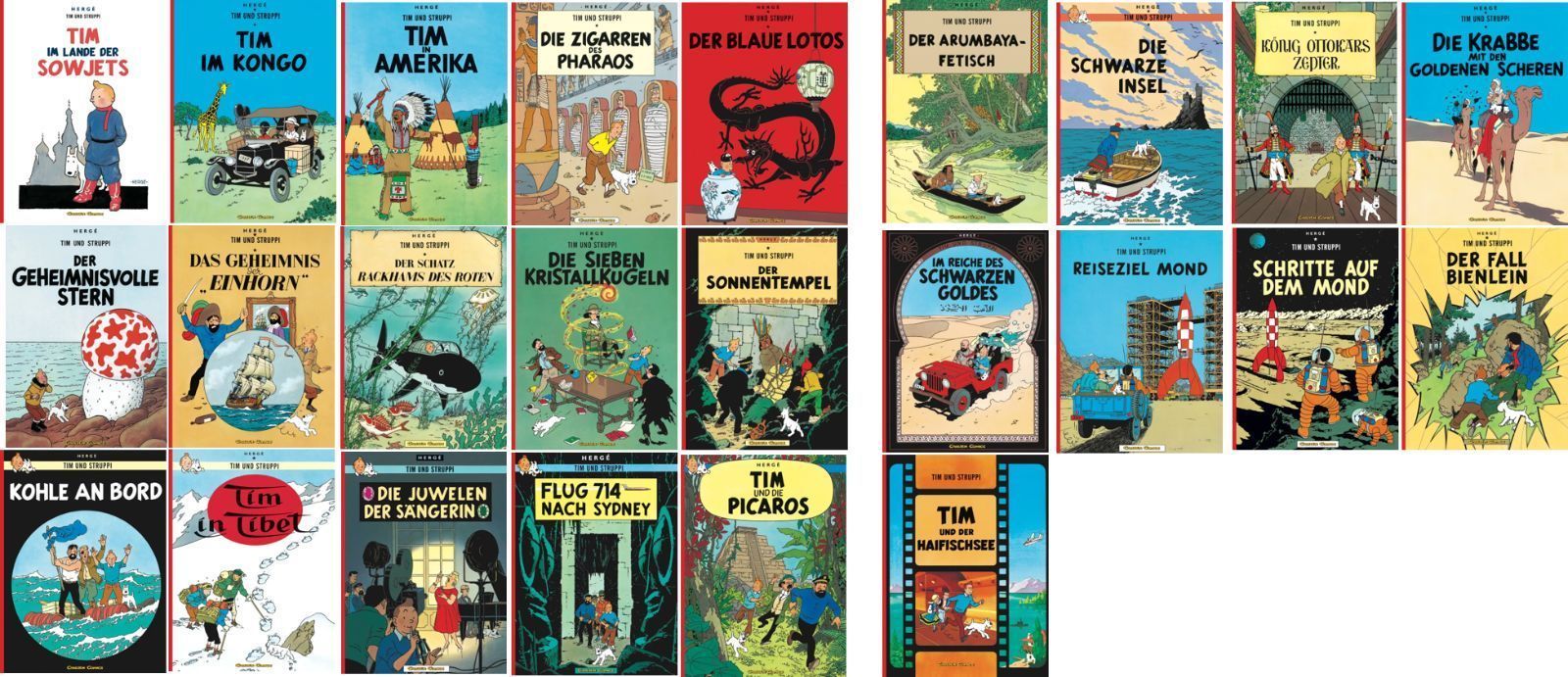 0 - Tim im Lande der Sowjets, 1 - Tim im Kongo, 2 - Tim in Amerika, 3 - Die Zigarren des Pharaos, 4 - Der Blaue Lotos