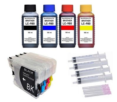 • 4 wiederbefüllbare Tintenpatronen kompatibel mit Brother LC-980 + 1000 + 400 ml Tinte