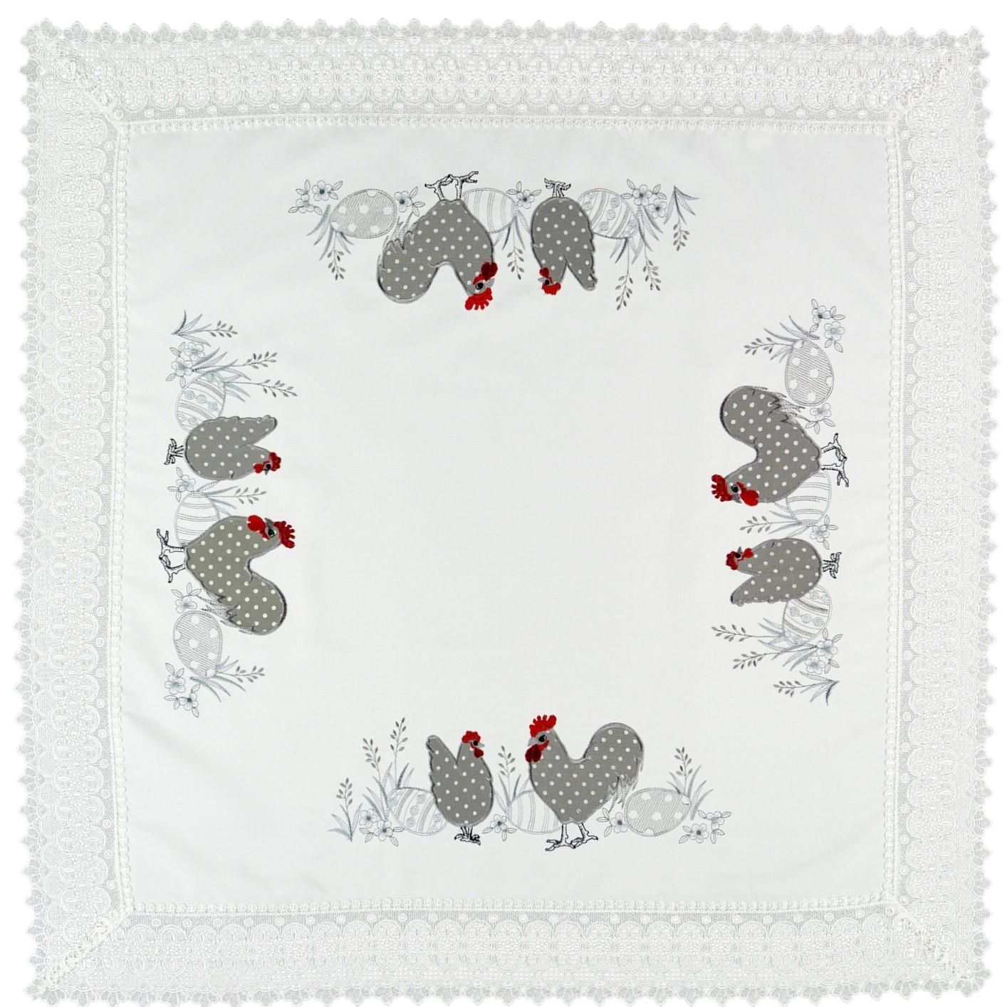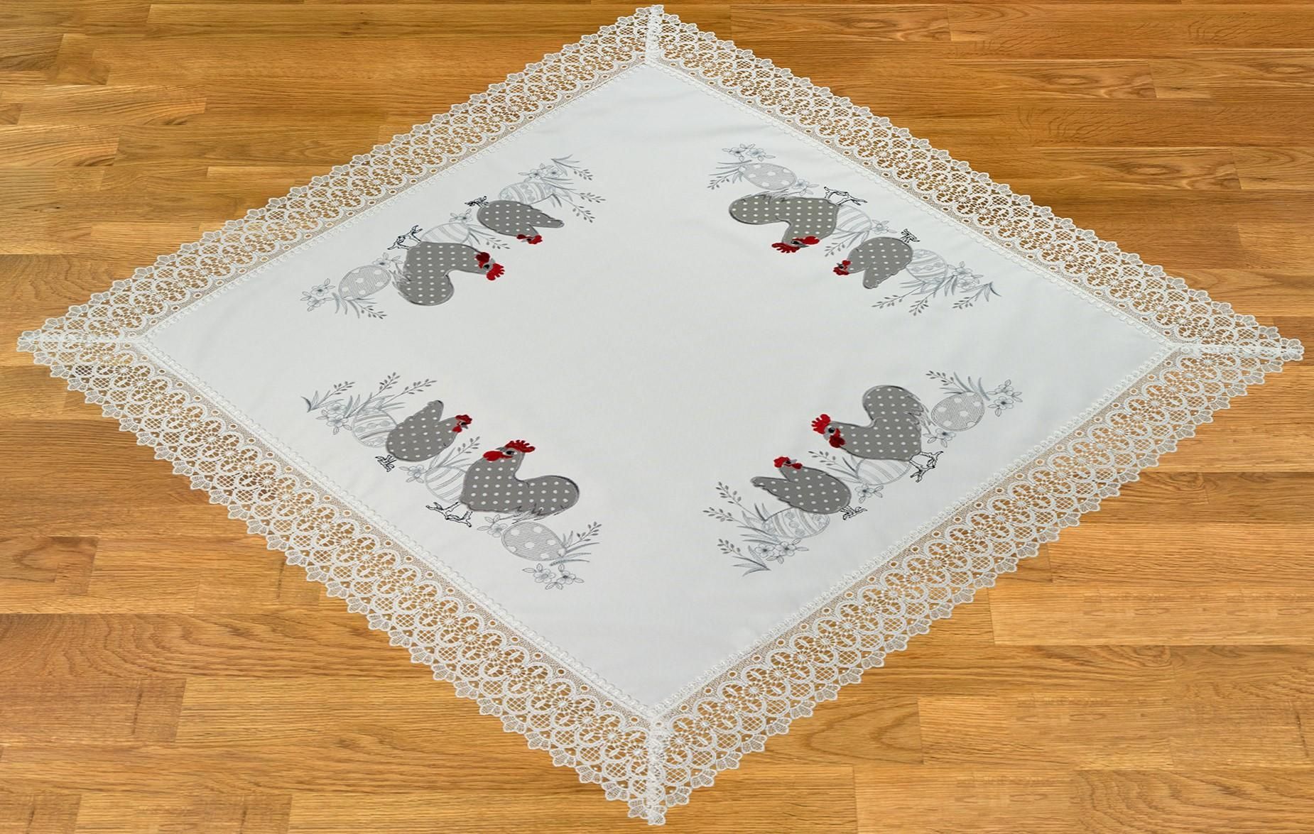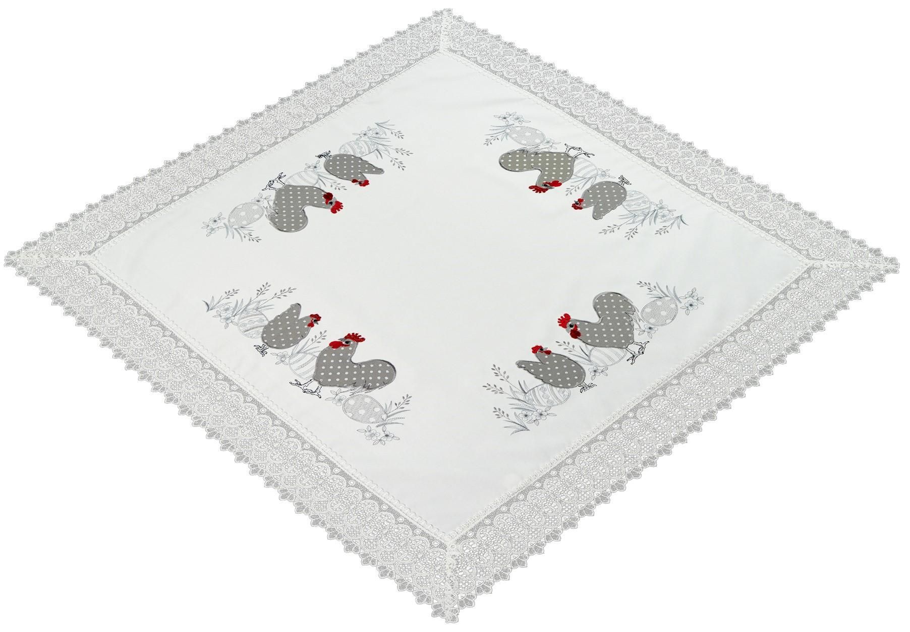 Tischdecke Ostern 85x85 Hühner Spitze Weiß Grau Spitzendecke Osterdecke Spitzentischd
