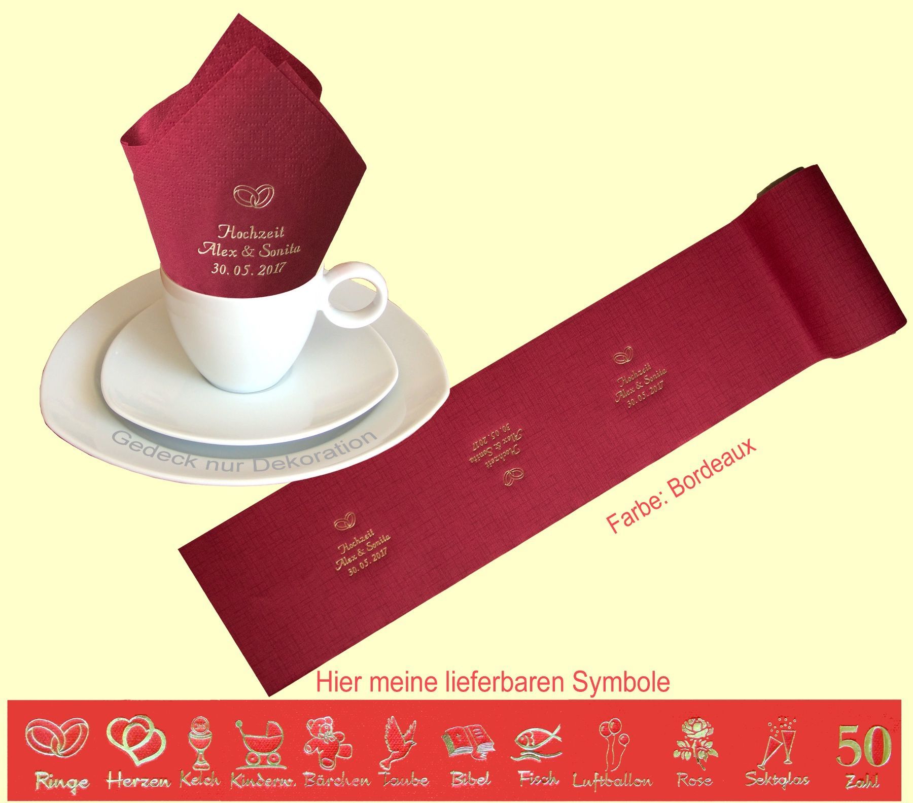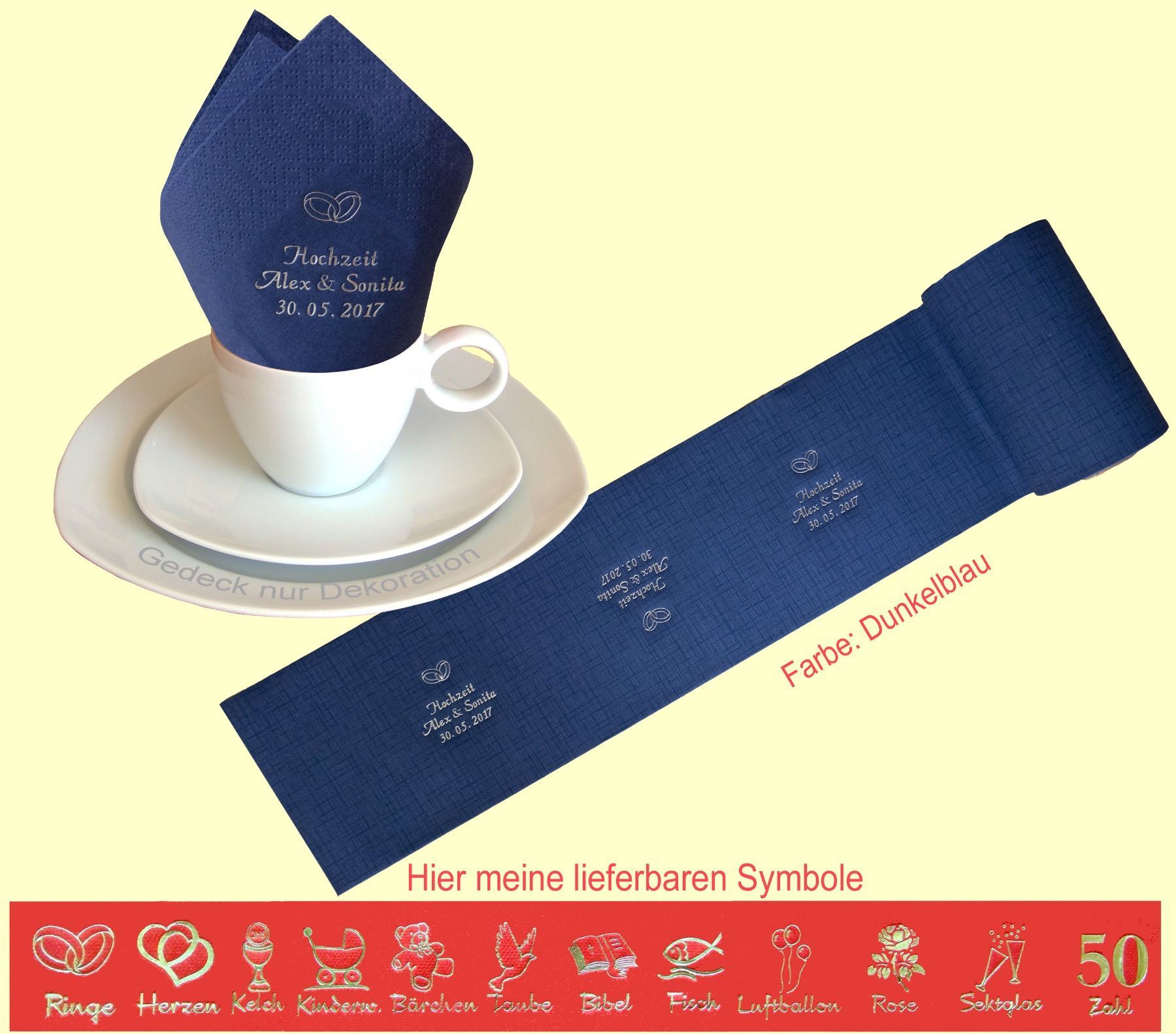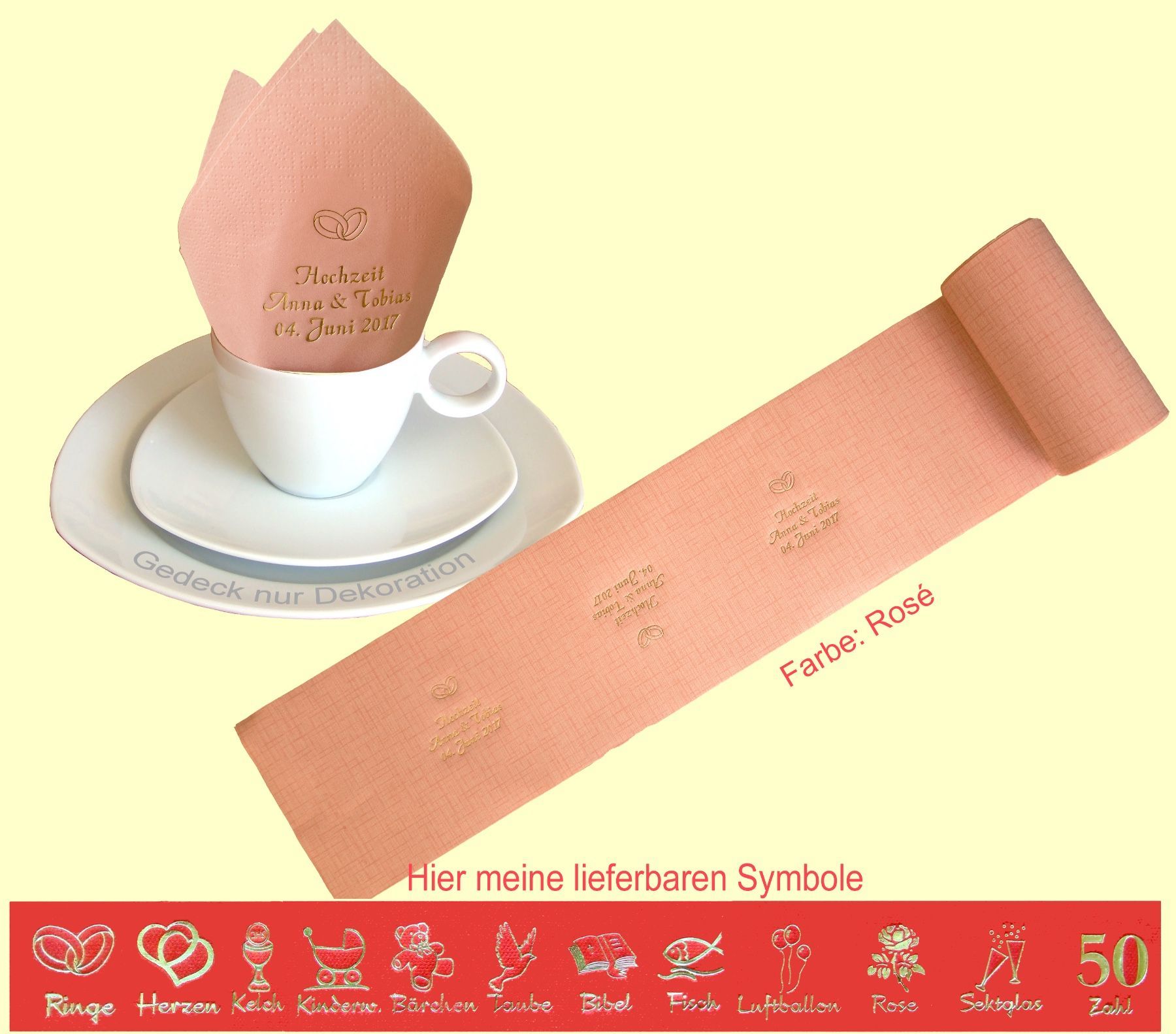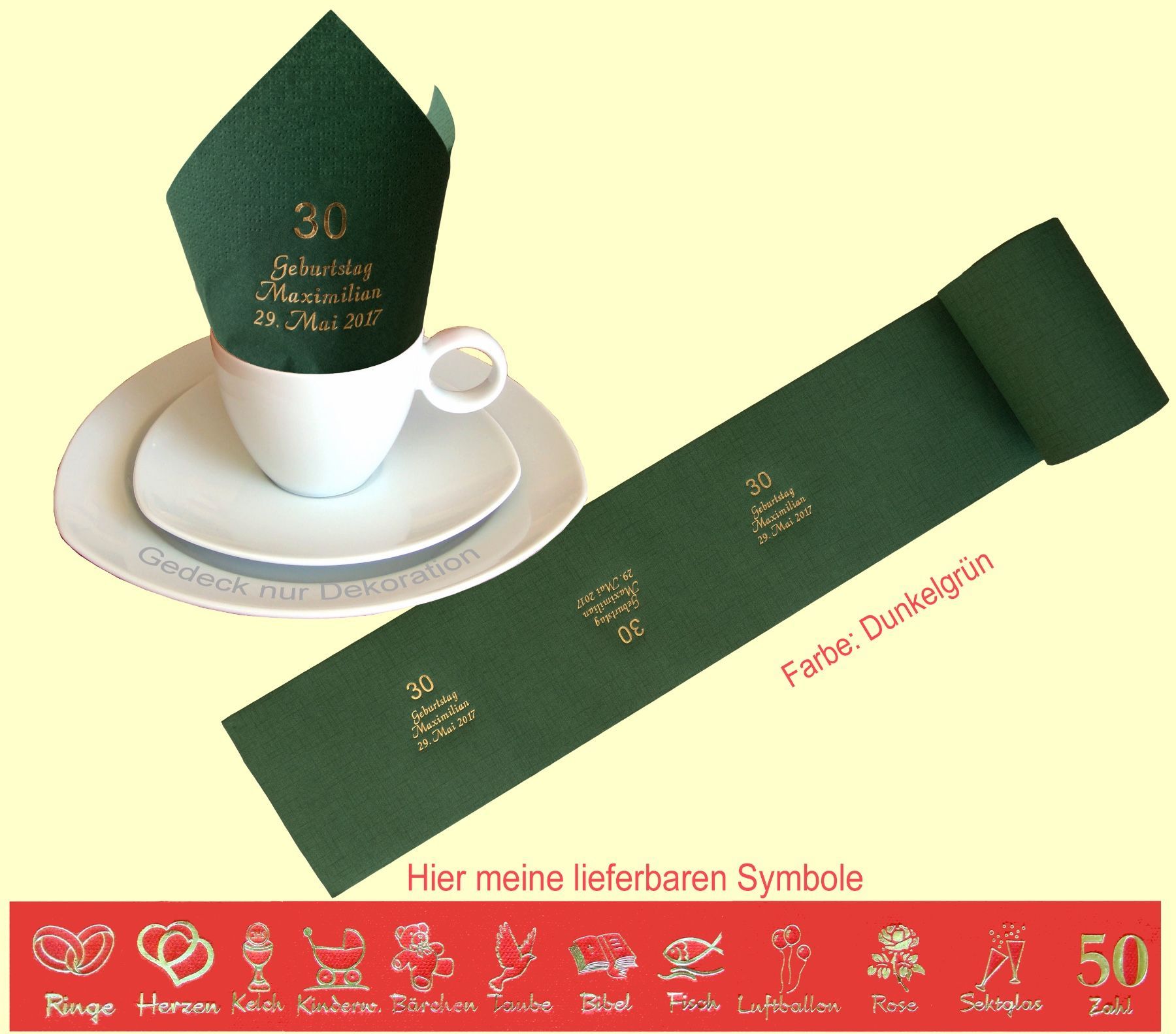 20 SERVIETTEN UND 5 METER TISCHBAND MIT NAMEN BEDRUCKT Servietten weich und elegant passend zu jedem Gedeck Tischband (15cm breit) in schöner Tissue-Qualität das i-Tüpfelchen für einen festlich gedeckten Tisch Schriftfarbe SILBER, KUPFER, GOLD oder SCHWARZ, WEISS, BLAU, GRÜN, ROT, ROSA Bitte Ihre Angaben zur Personalisierung nach dem Kauf mitteilen. - welche Feier - Datum der Feier - gewünschter Namen - welches Symbol - welche Schriftfarbe