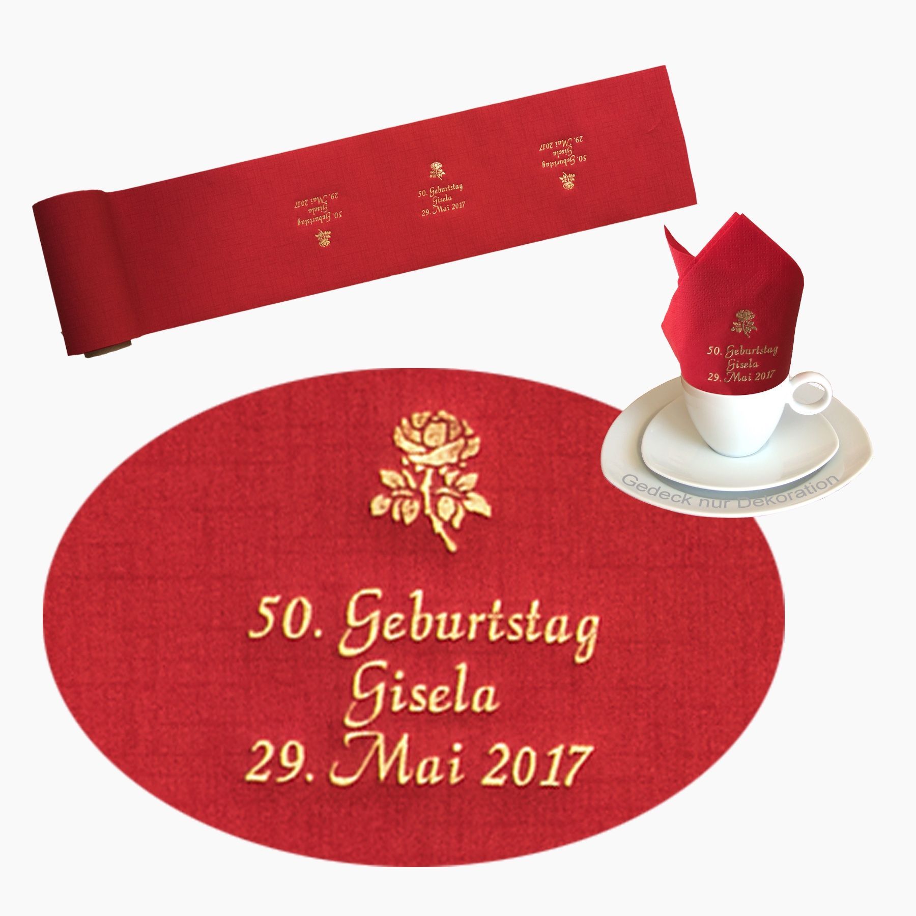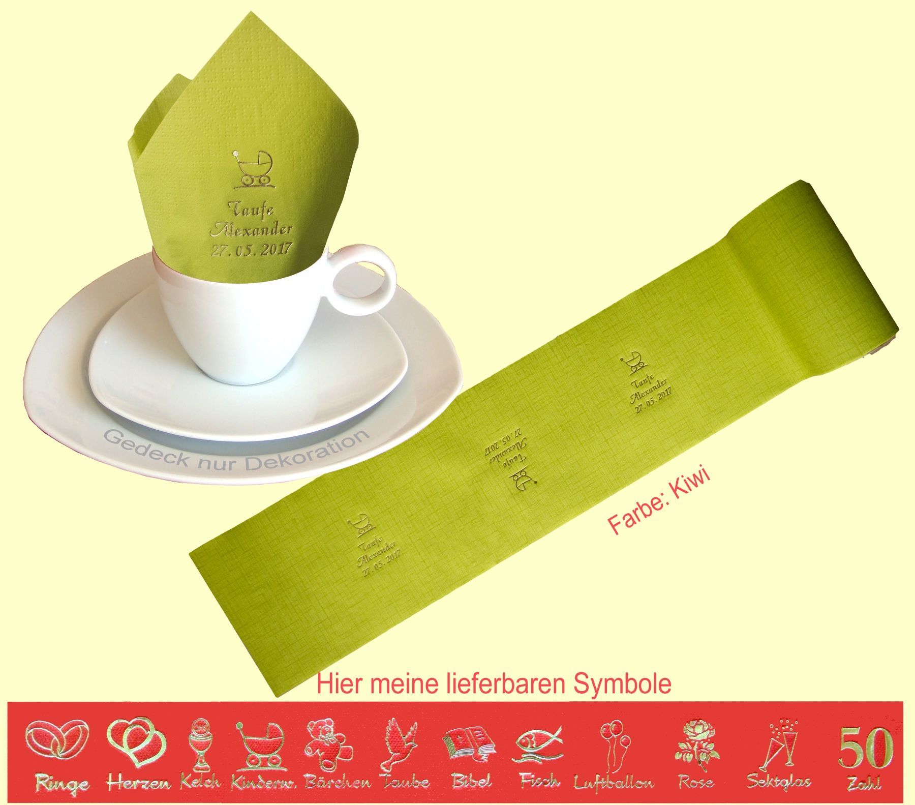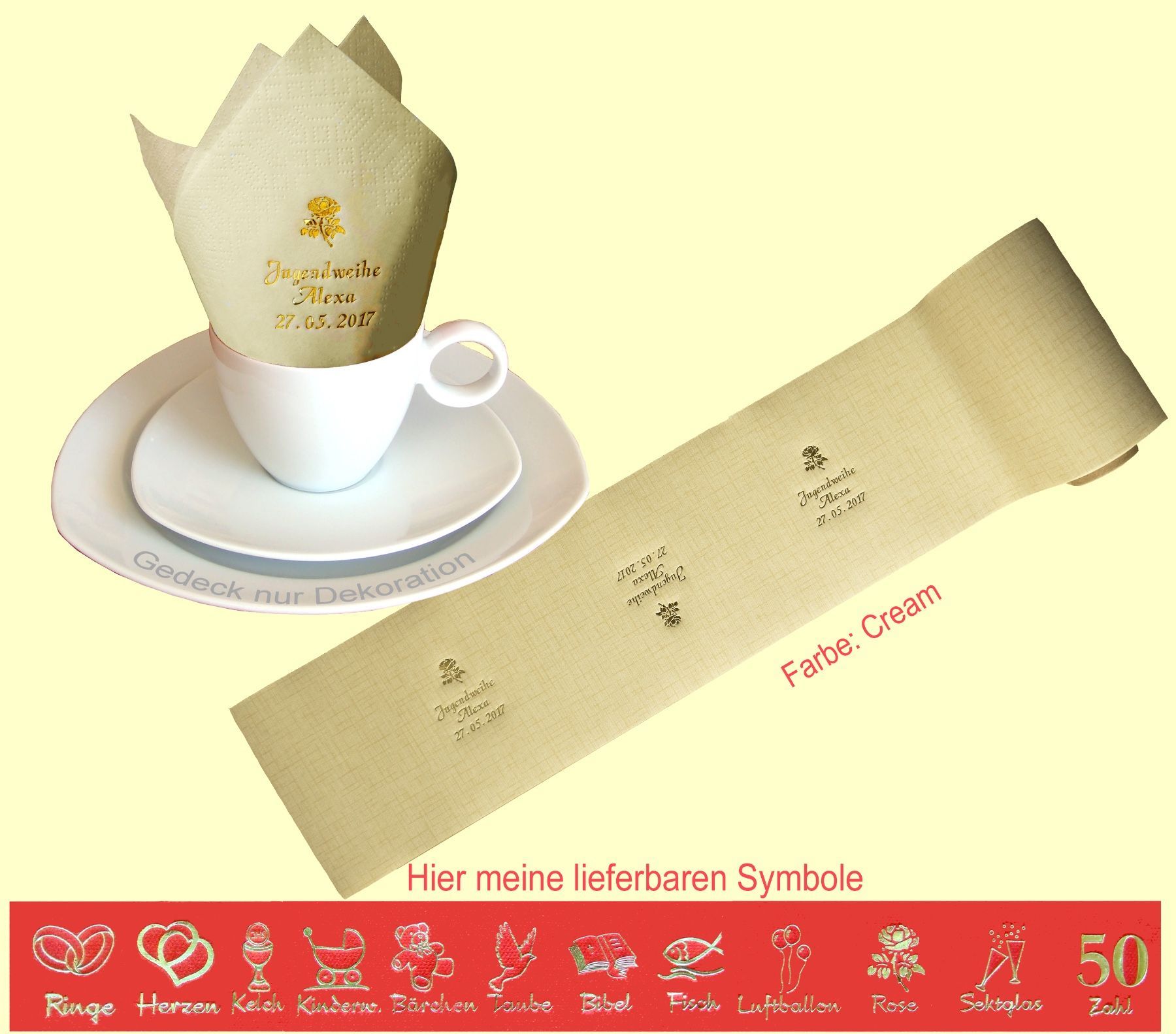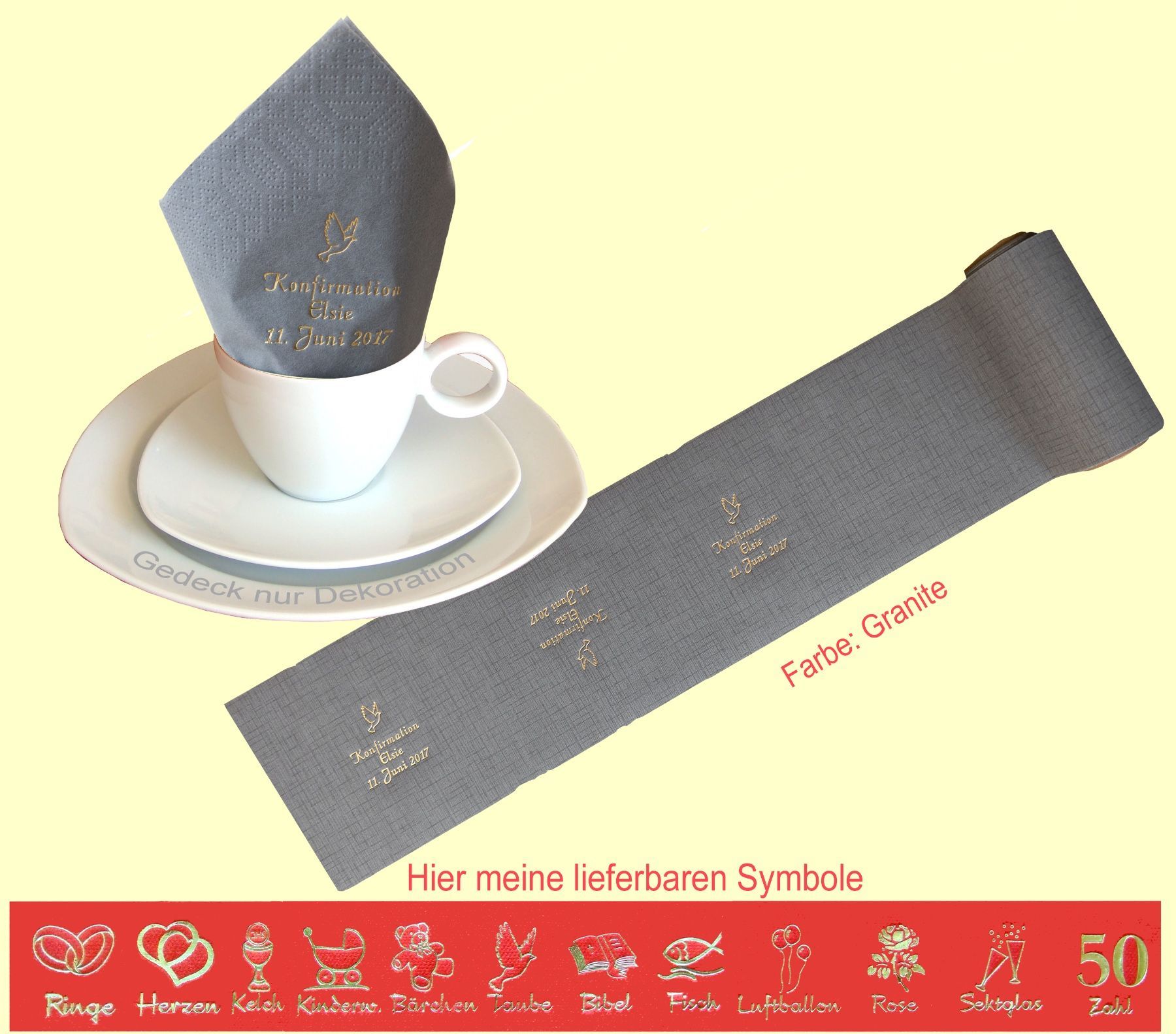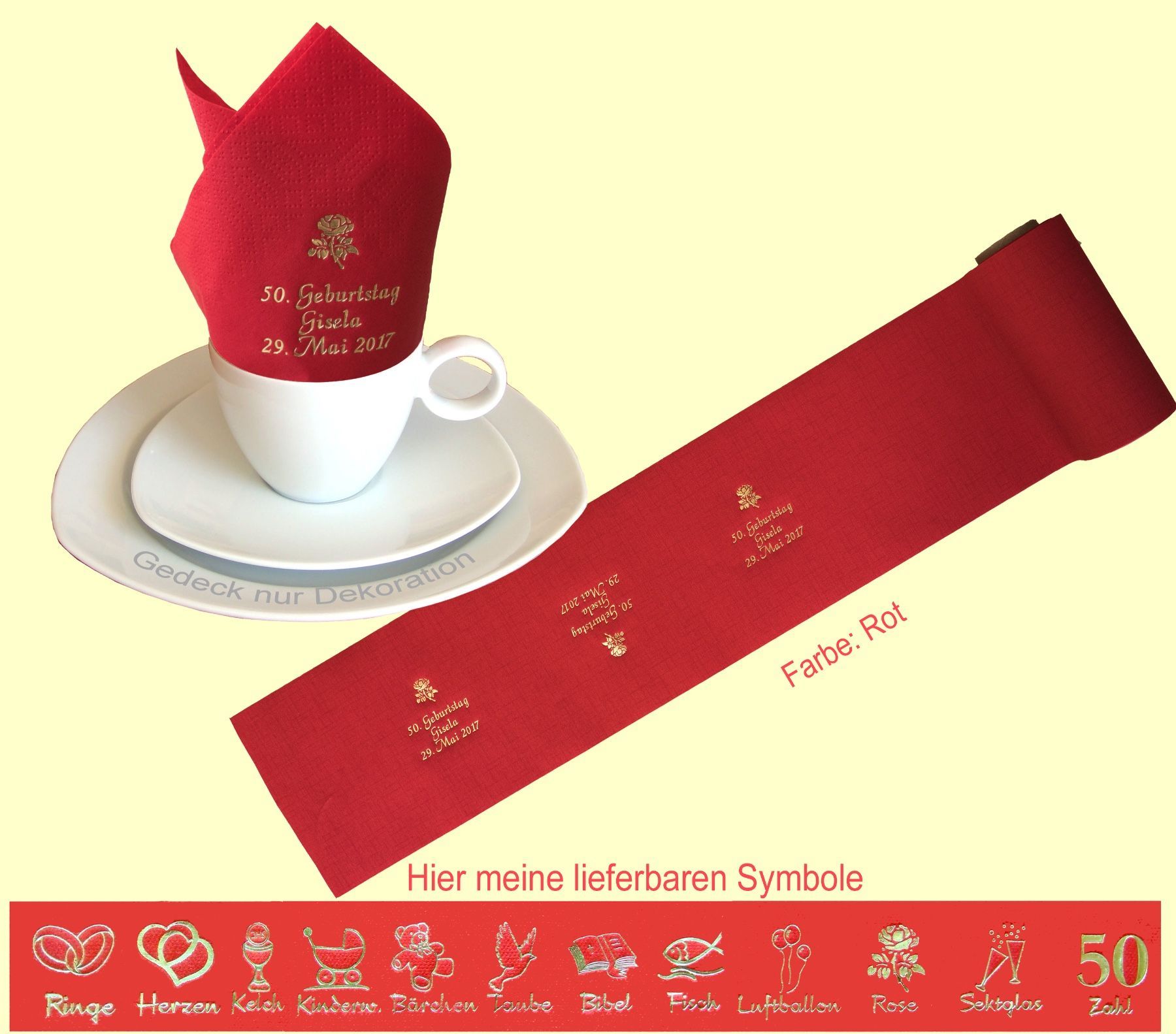 20 SERVIETTEN UND 5 METER TISCHBAND MIT NAMEN BEDRUCKT Servietten weich und elegant passend zu jedem Gedeck Tischband (15cm breit) in schöner Tissue-Qualität das i-Tüpfelchen für einen festlich gedeckten Tisch Schriftfarbe SILBER, KUPFER, GOLD oder SCHWARZ, WEISS, BLAU, GRÜN, ROT, ROSA Bitte Ihre Angaben zur Personalisierung nach dem Kauf mitteilen. - welche Feier - Datum der Feier - gewünschter Namen - welches Symbol - welche Schriftfarbe