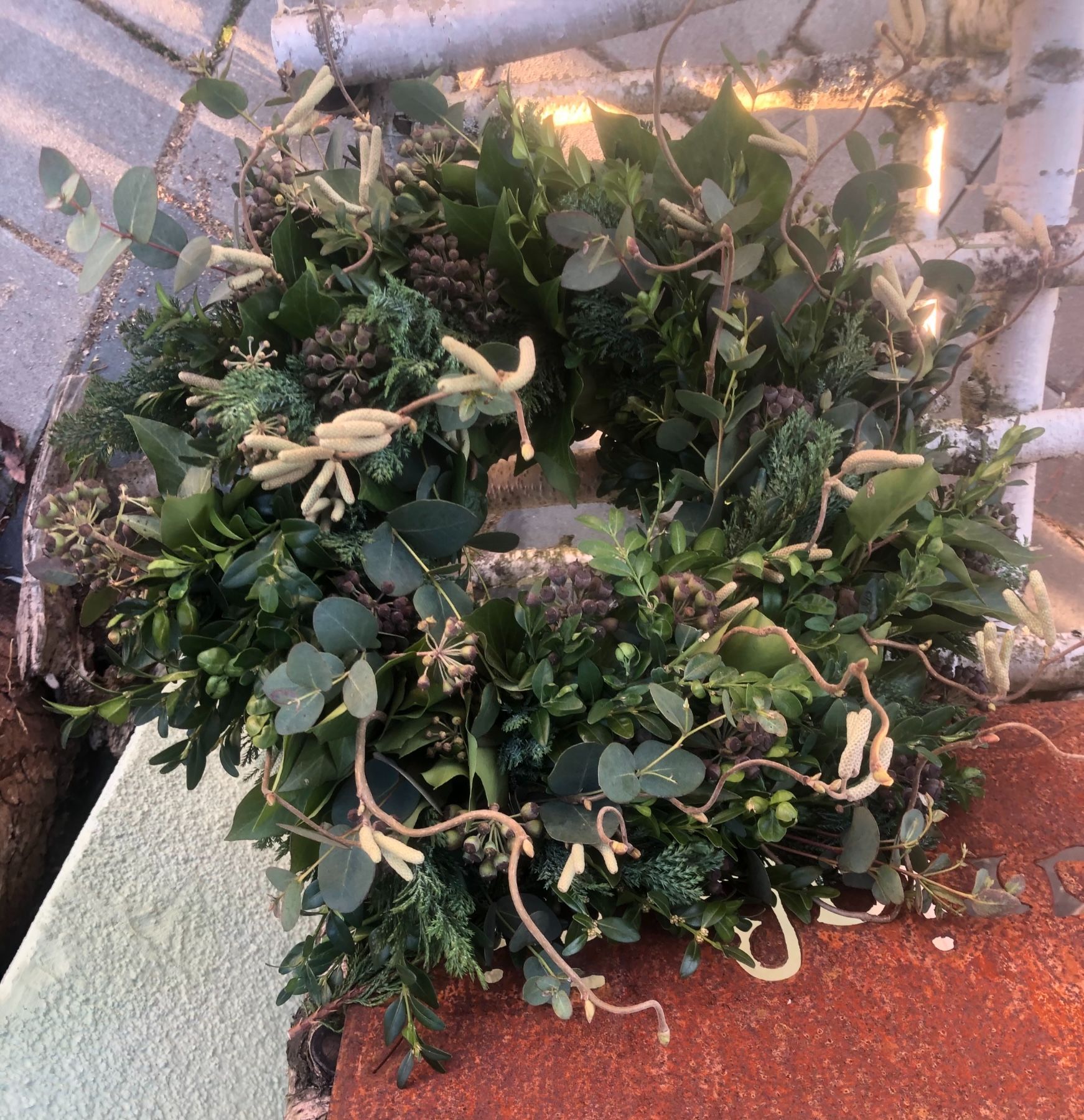 Hallo Biete diesen tollen Tischkranz, gebunden auf einen Strohröhmer mit Bux, Efeu, Thujen, Eukalyptus und Haselnuss Korkenzieher. Durchmesser circa 35-40cm.