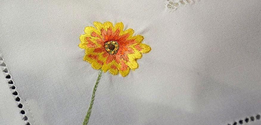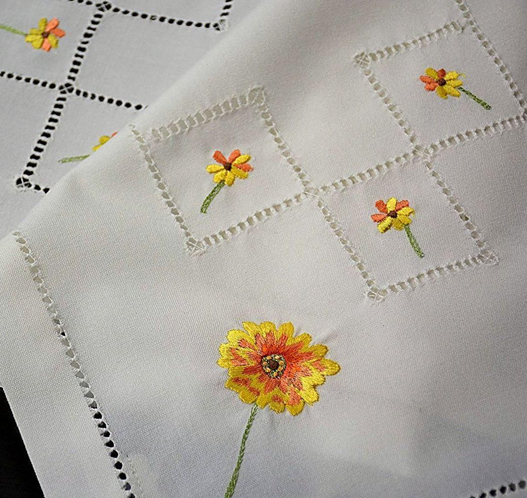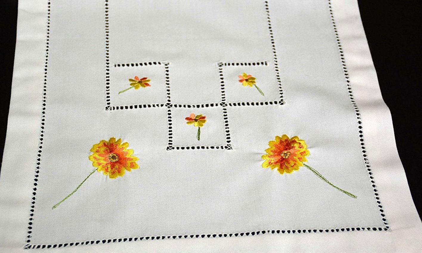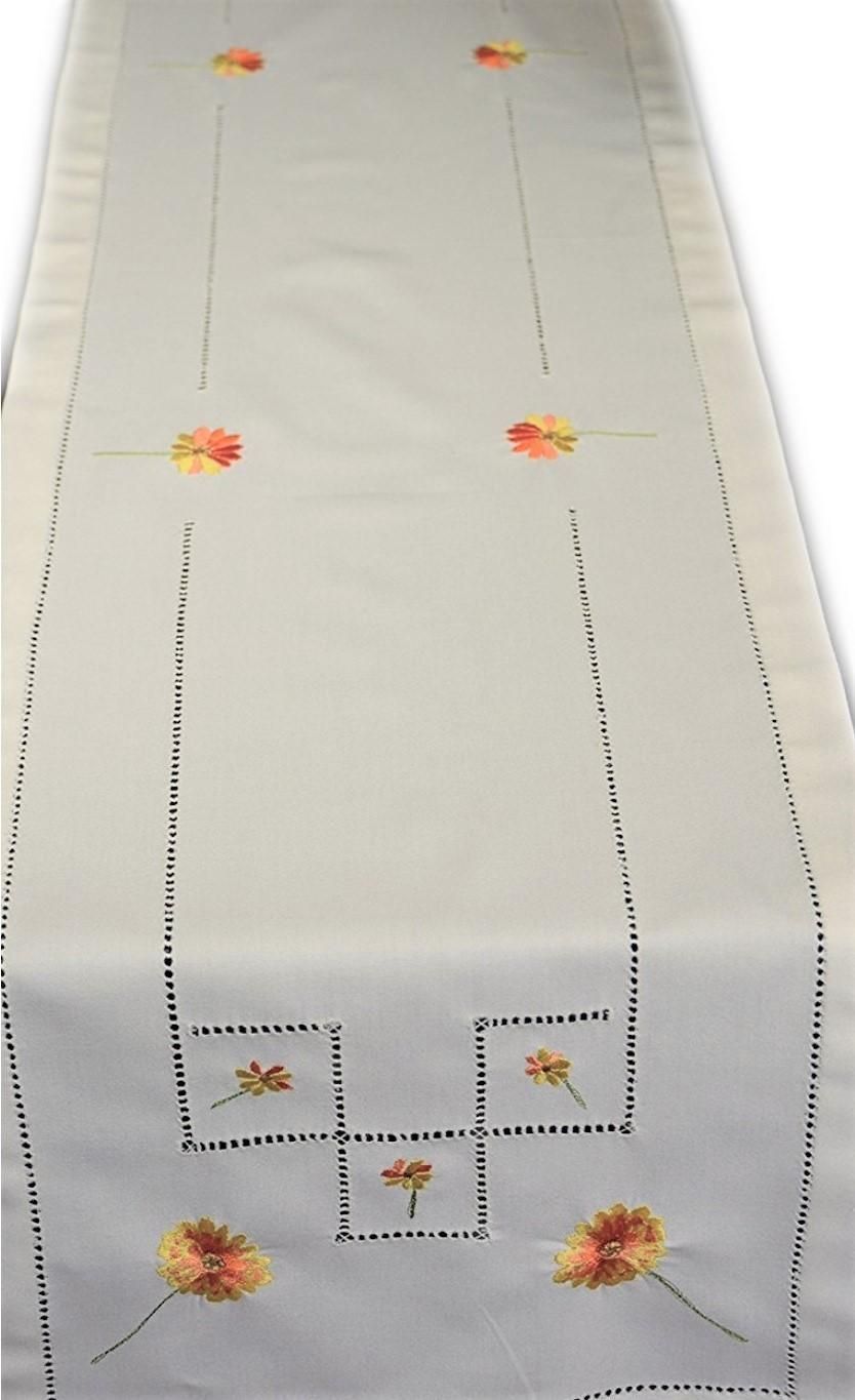 Hossner Gerbera * Pflegeleichte Tischdecke ca. 30x140 cm in Weiß mit farbiger Stickerei und Hohlsaum, zeitloses Dekorationselement in klassischem Design, Material: 65% Polyester, 35% Viskose.