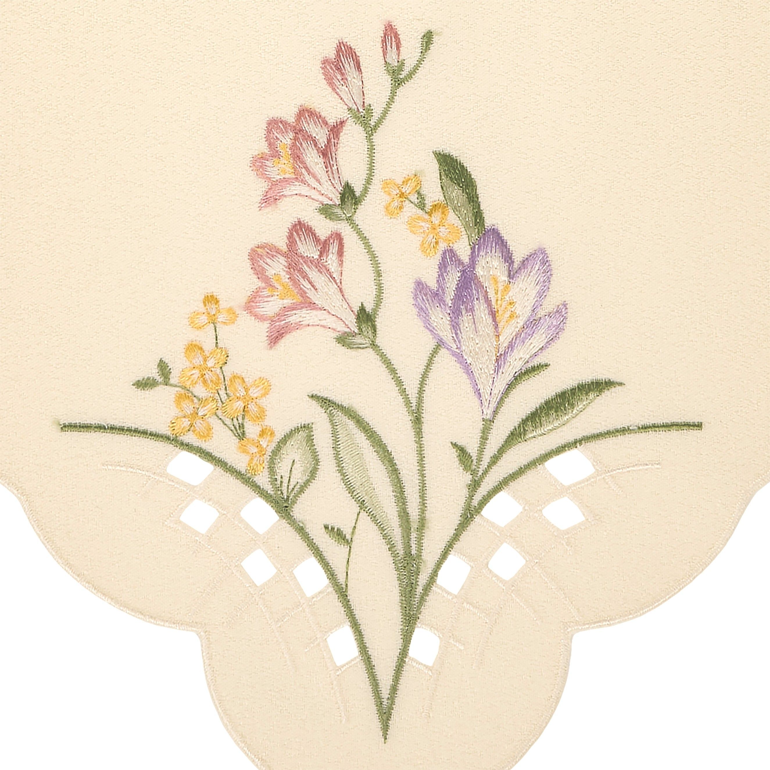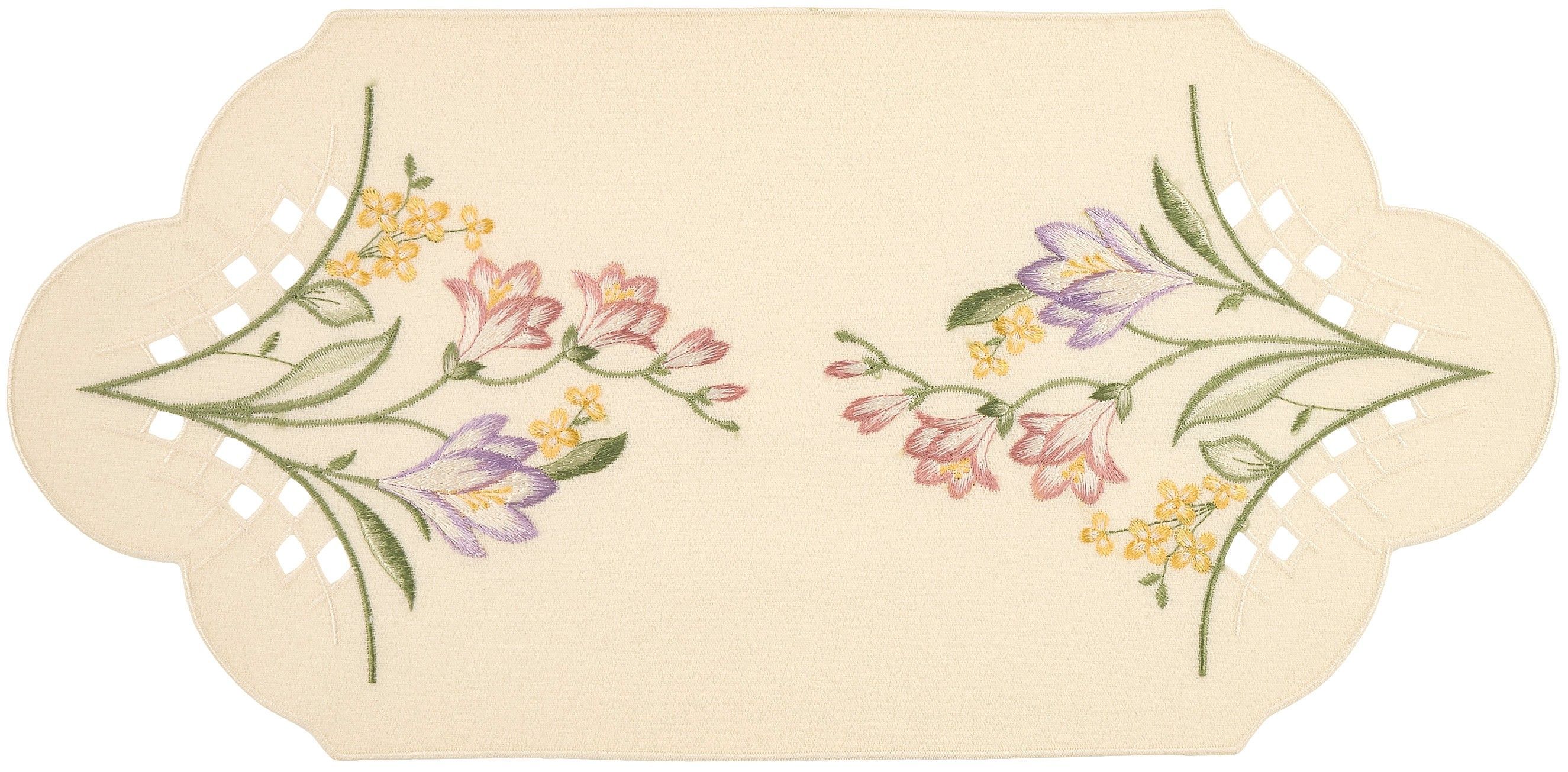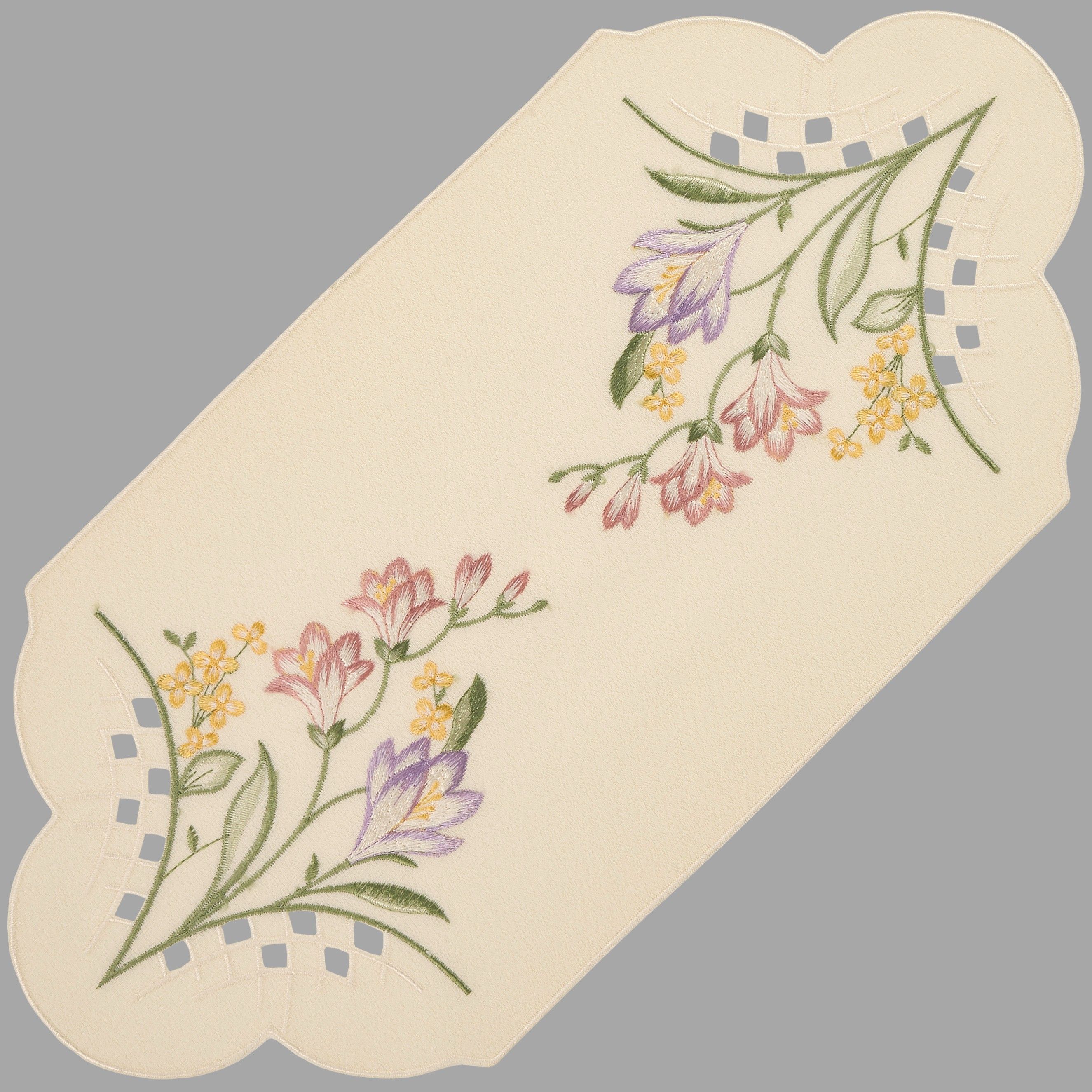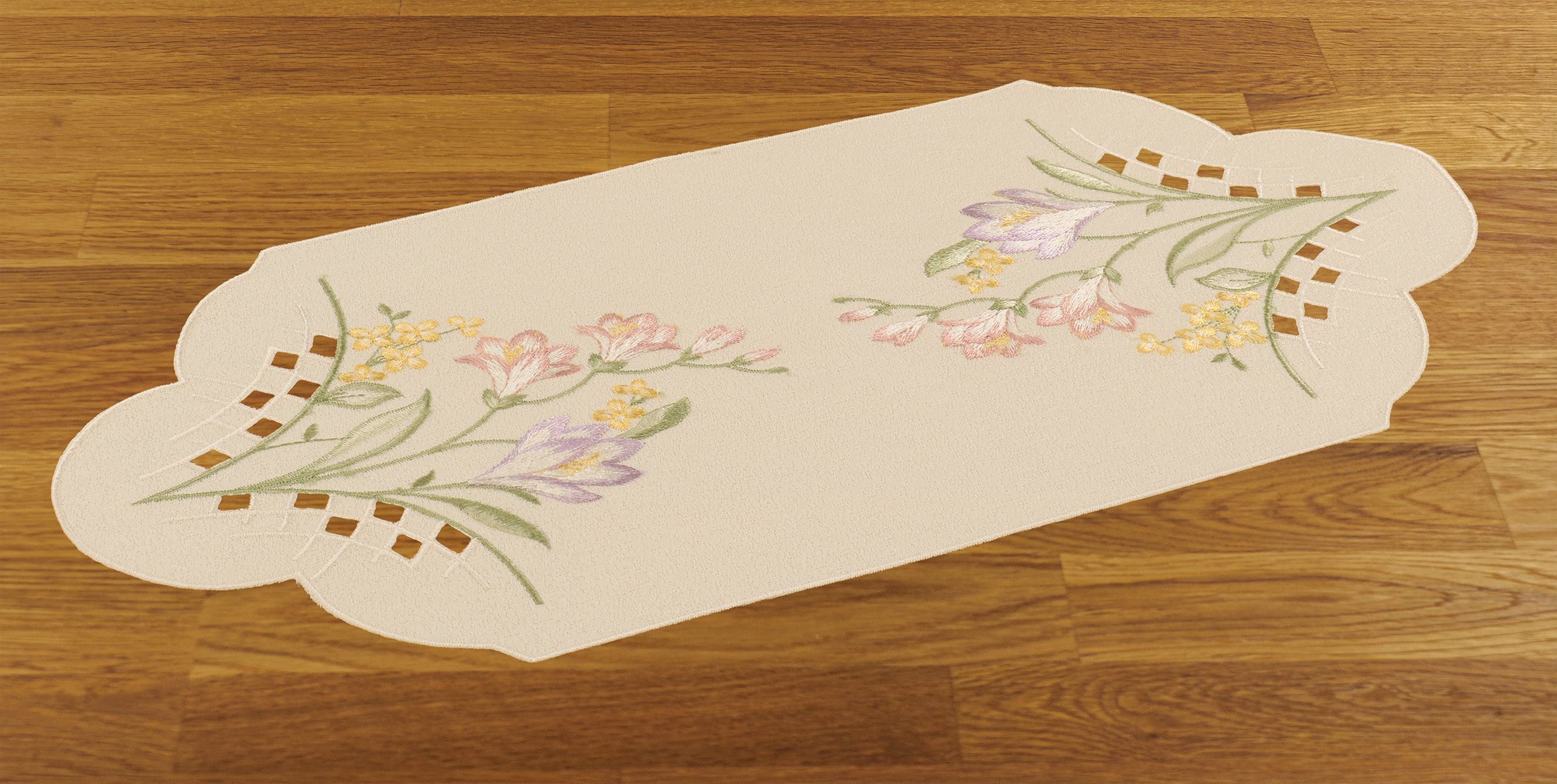 Tischläufer Frühling Tischdecke Plauener Spitze Oval 22 x 45 Stickerei Freesien