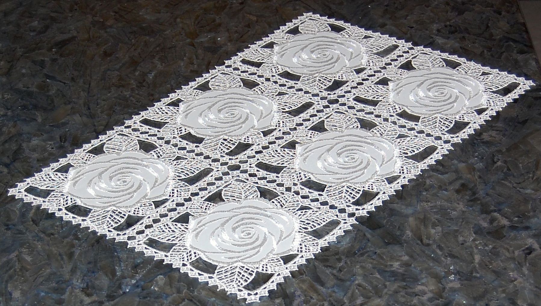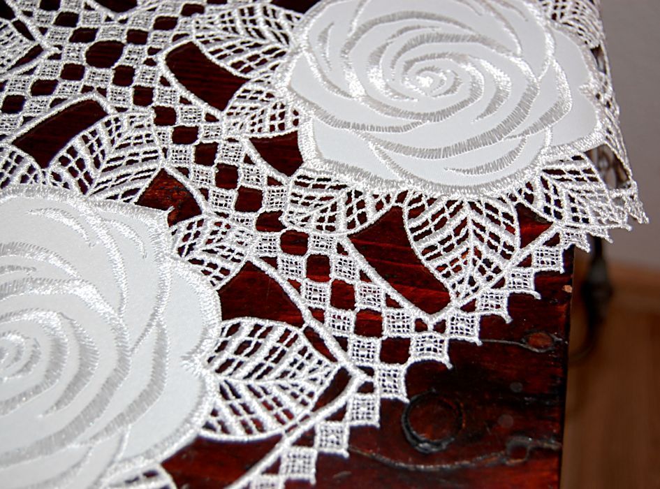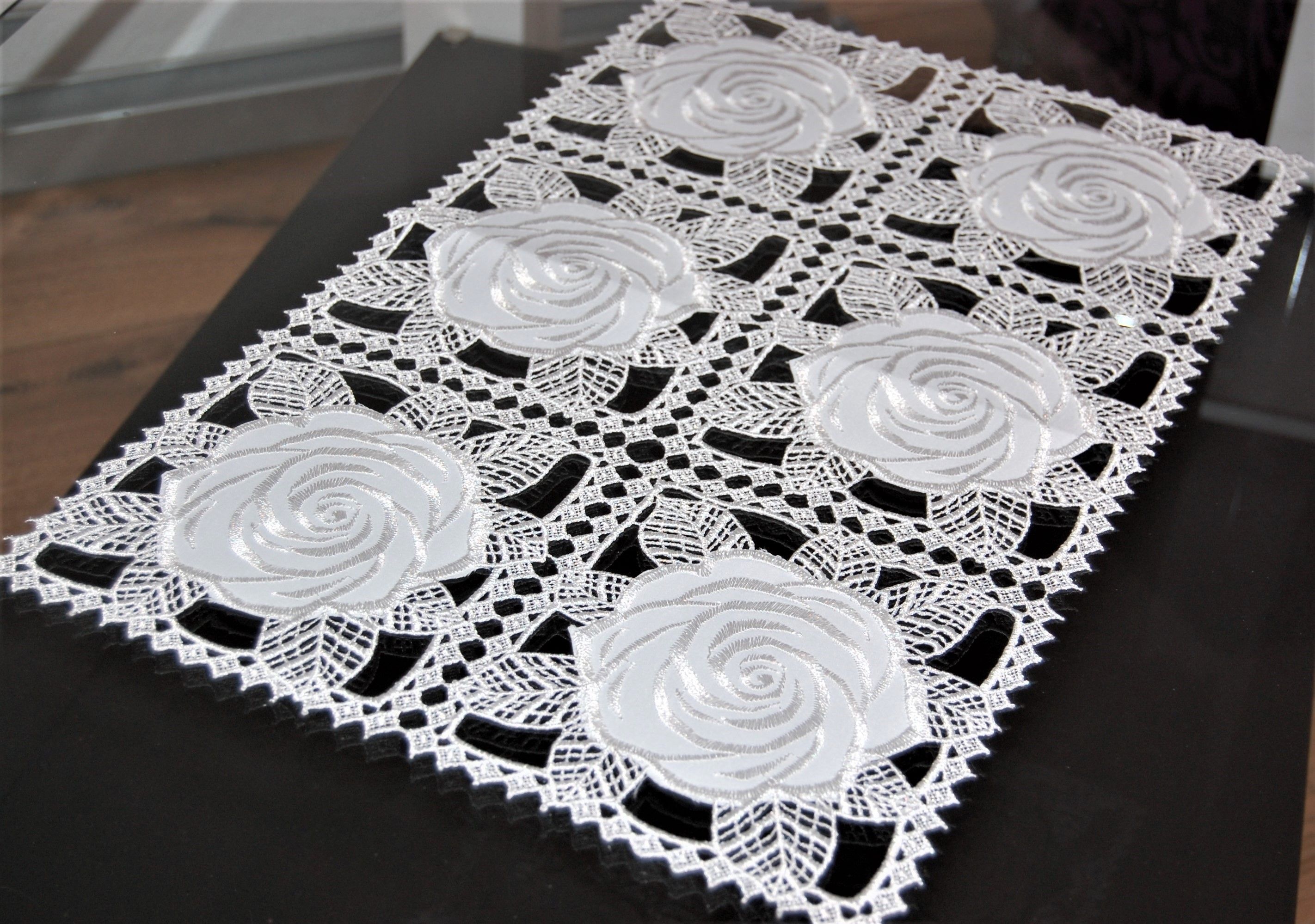 Tischläufer Weiß Plauener Spitze 30x45 Rosen Stickerei Rosen Spitzendeckchen
