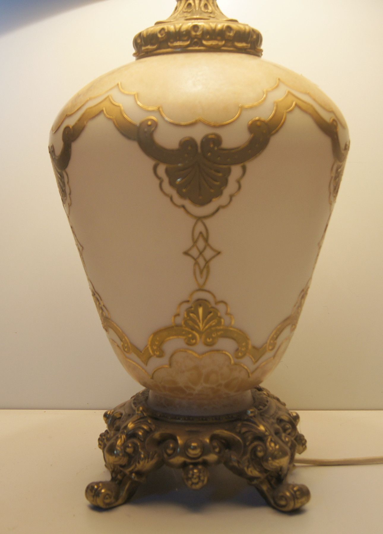 Tischlampe um 1930. Material: Glas Messing. Herkunft: Frankreich. Der Lampenschirm ist späteren Datums und kann leicht entfernt werden. Maße: H 80 cm. Lampe kommt in 2 Paketen! Antikes am Deich - Inh: Oliver Kipp-Trense