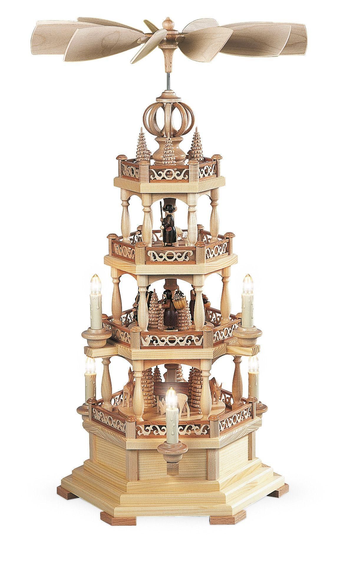 Tischpyramide Waldmotiv 3-stöckig natur elektr. bel. + angetrieben Holzpyramide