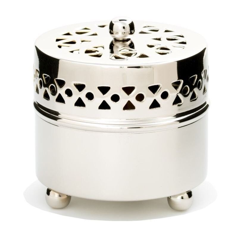 Tischrauchfass, tolle moderne Form, silberfarben, Durchmesser 80mm, Höhe 100mm, Messing vernickelt und poliert, mit separatem Kohlepfännchen
