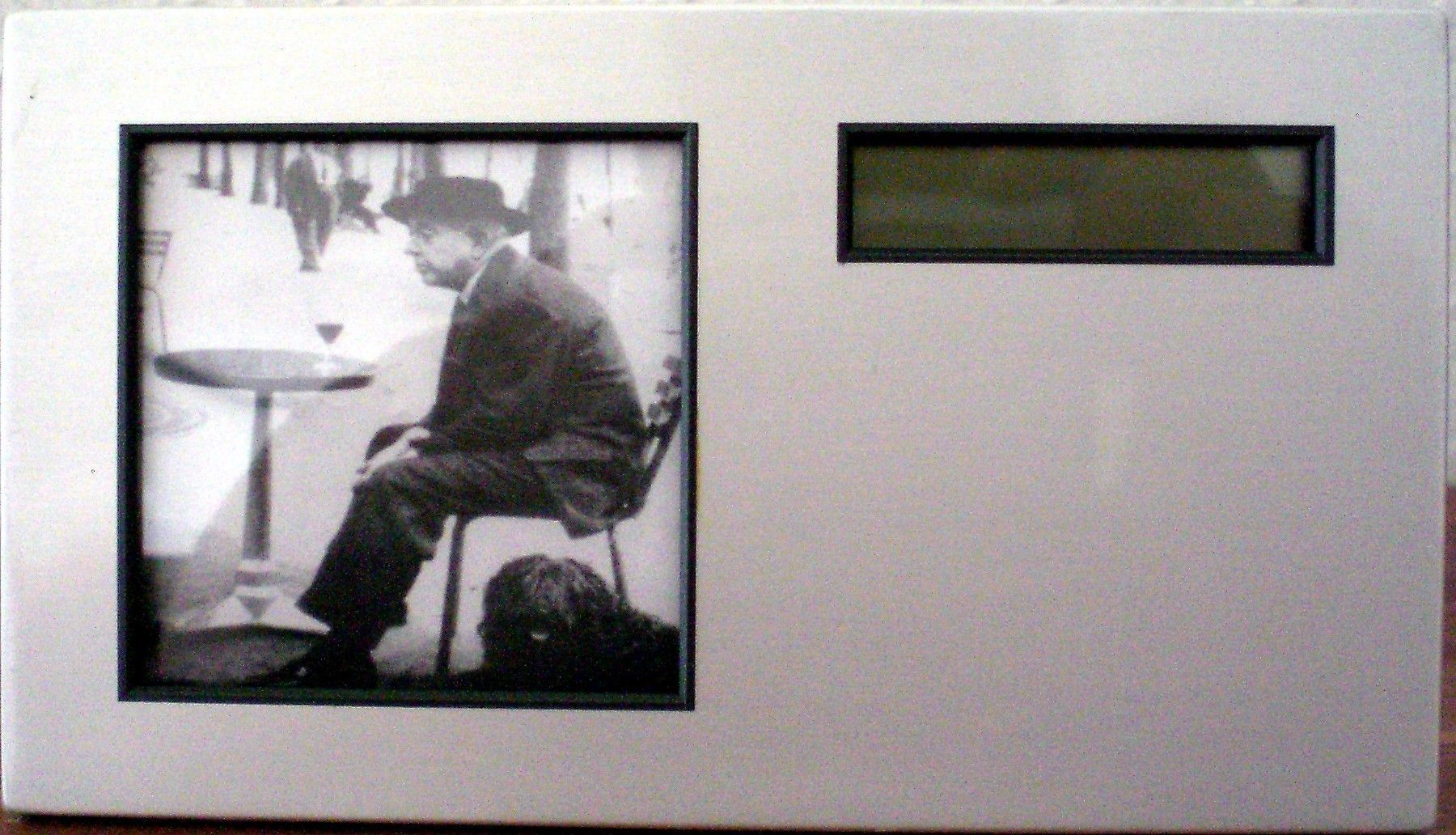 Tischuhr mit Bilderrahmen und Laufschrift