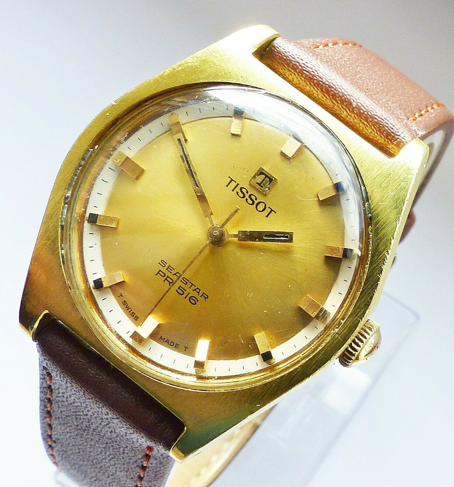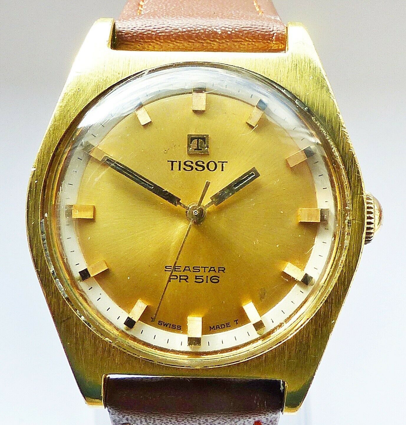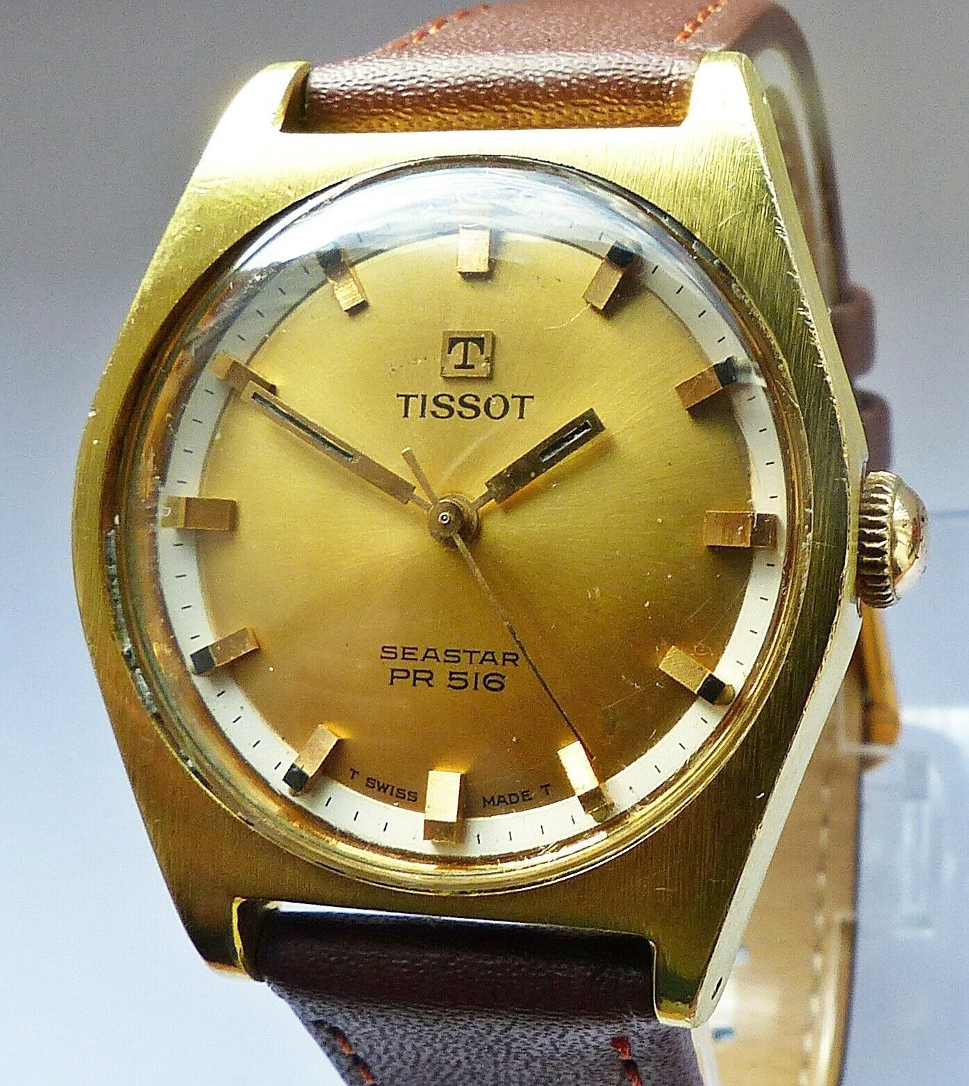 Hersteller : Tissot & Fils Modell PR516 Seastar mit grosser zentraler Sekunde, Goldfarbenem Zifferblatt mit aufgesetzten Reflektorindexen, fluoreszierenden Zeigern und Indexpunkten Uhrwerk : Kaliber 786-1 Tissot&Fils Handaufzug mit 17Jewels Material Gehäuse : Edelstahl und Golddoublee vergoldet Durc
