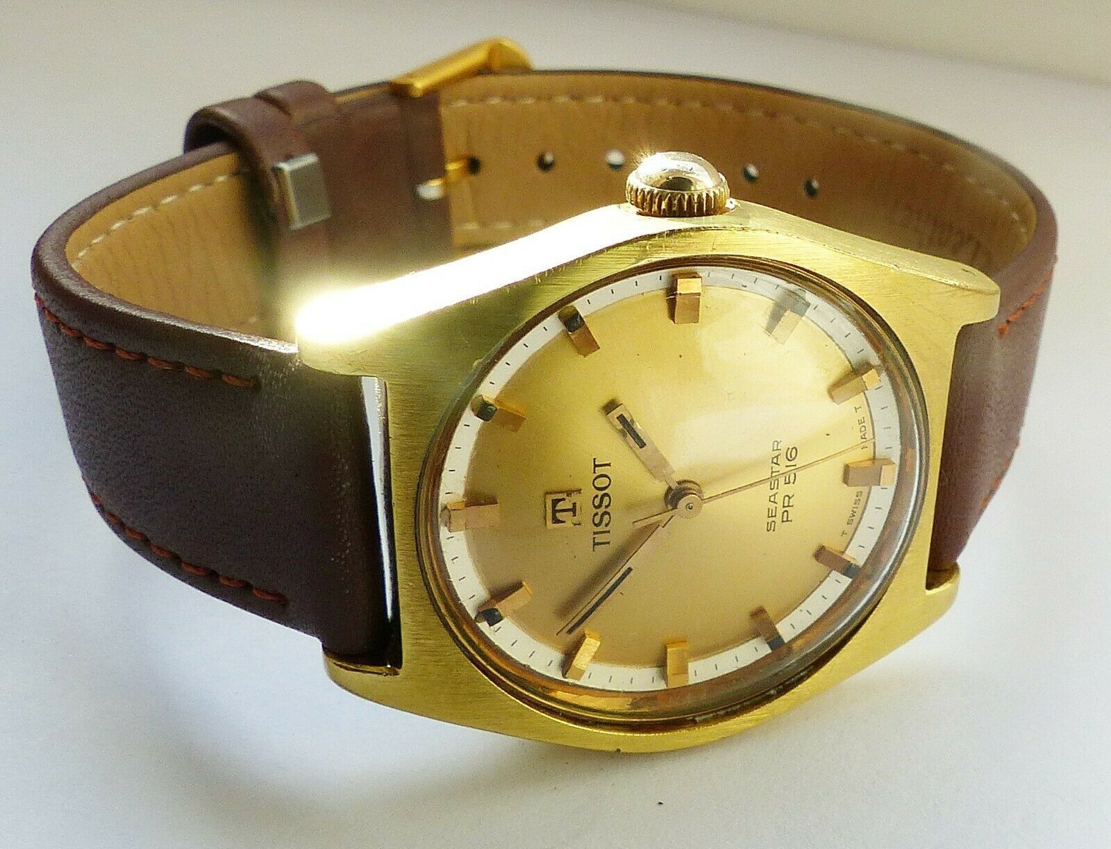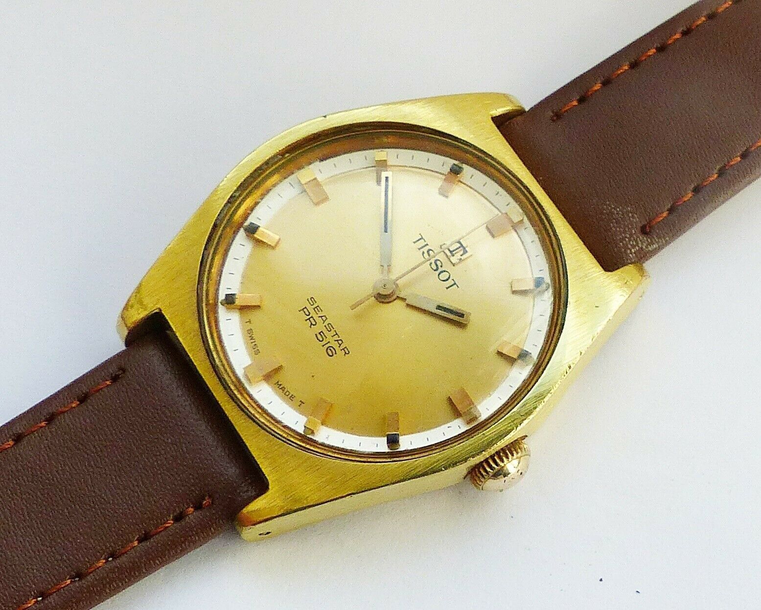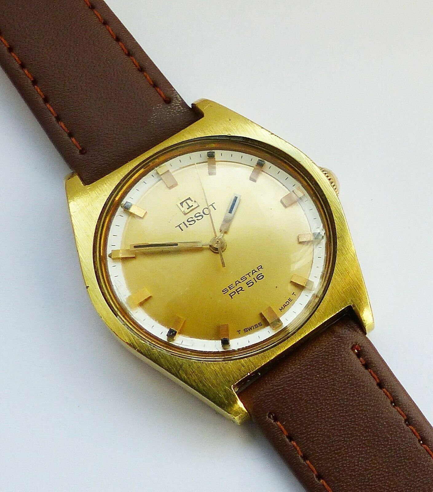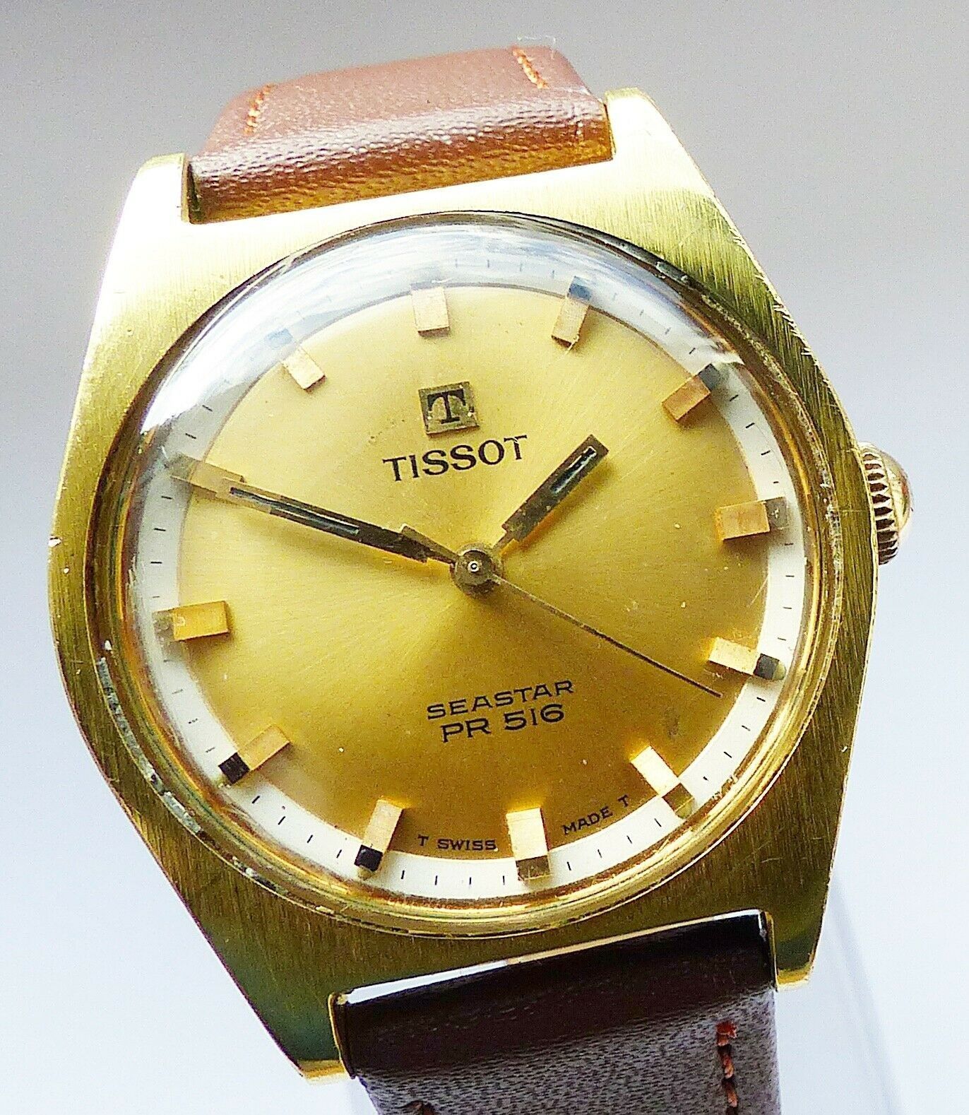 Hersteller : Tissot & Fils Modell PR516 Seastar mit grosser zentraler Sekunde, Goldfarbenem Zifferblatt mit aufgesetzten Reflektorindexen, fluoreszierenden Zeigern und Indexpunkten Uhrwerk : Kaliber 786-1 Tissot&Fils Handaufzug mit 17Jewels Material Gehäuse : Edelstahl und Golddoublee vergoldet Durc