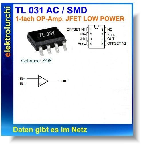 Sie bieten hier auf folgenden Artikel 5 Stück TL031AC - 1-fach Operationsverstärker, FET Low Power TL 0311, SMD SO8 Gehäuse: SO8 Hersteller: Texas Instruments