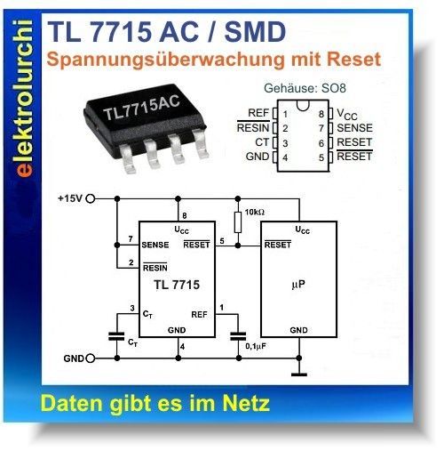 Sie bieten hier auf folgenden Artikel NEU 2 Stück TL7715AC - Spannungsüberwachung mit µP Reset, SMD SO8 IC TL 7715 AC, TI Hersteller: Texas Instruments Daten gibt es im Netz