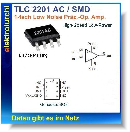 Sie bieten hier auf folgenden Artikel 5 Stück TLC2201AC - 1-fach Low-Noise High-Speed- Op.Amp., SMD SO8, Texas Instr Gehäuse: SO8 Hersteller: Texas Instruments