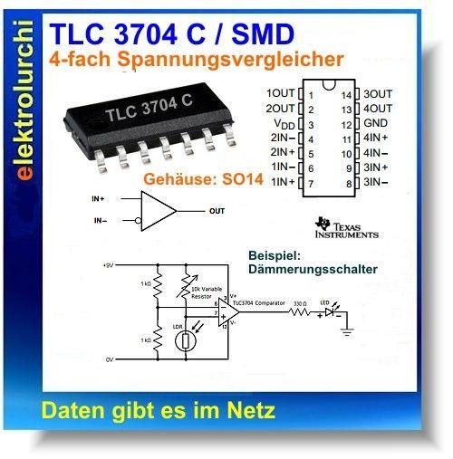 Sie bieten hier auf folgende Artikel NEU 3 Stück TLC3704 - 4-fach Komparator, SO14, Texas Inst., Baugleich LM339D Anwendung: Einfacher Aufbau von Spannungsüberwachungen z.B. im Kfz Technische Daten Versorgungsspannung - min.: 2V Versorgungsspannung - max.: 36 V Betriebsversorgungsstrom: 2 mA Ansprec